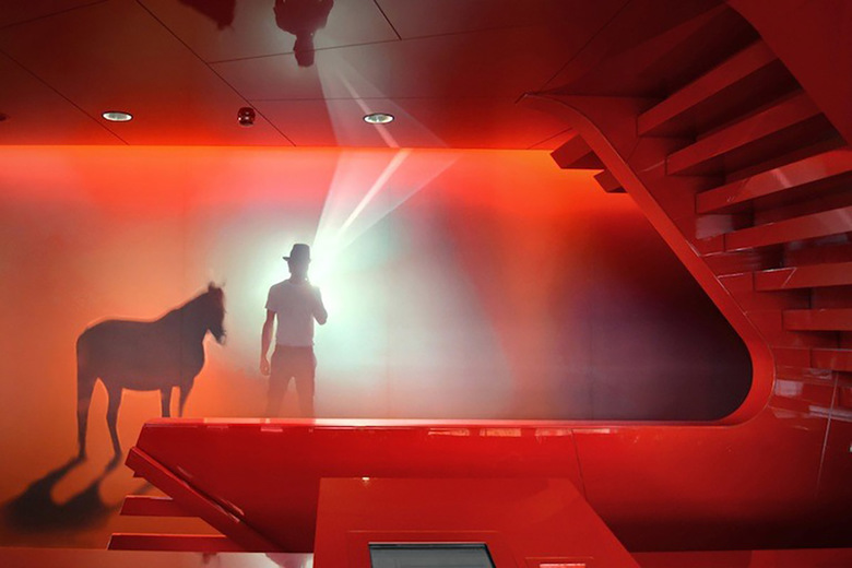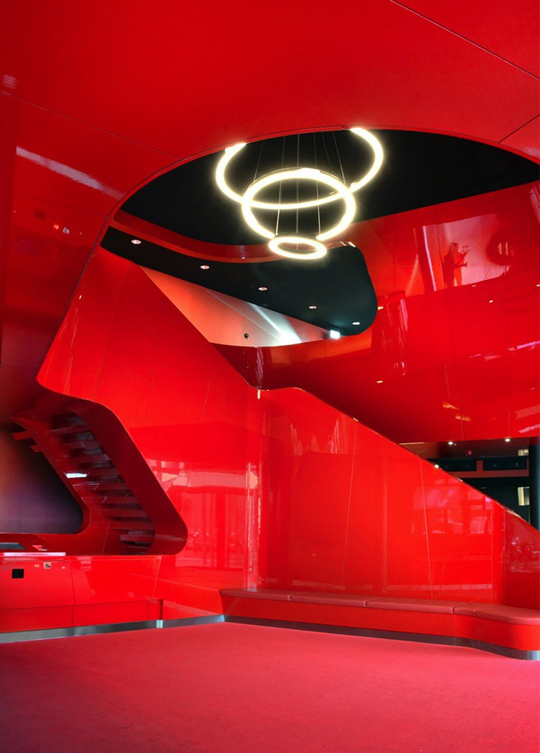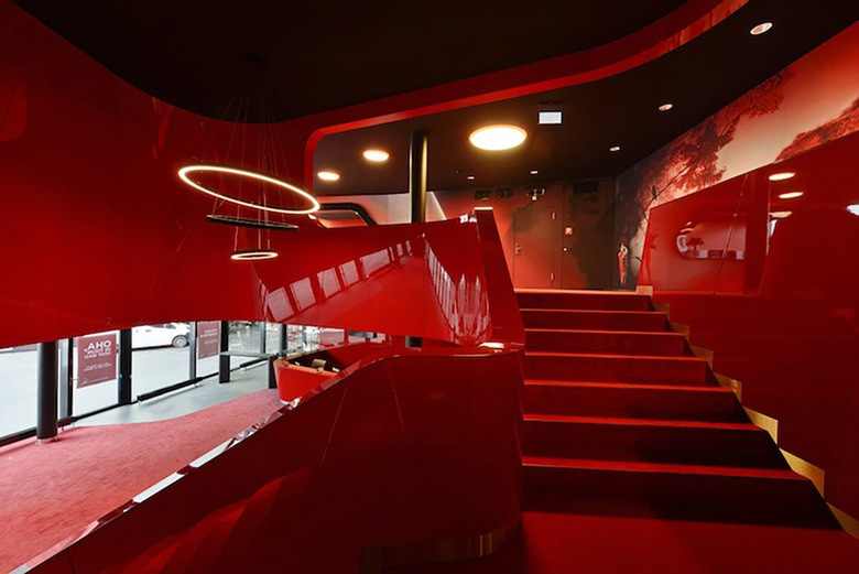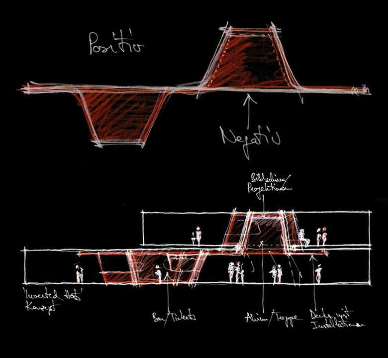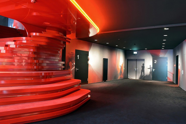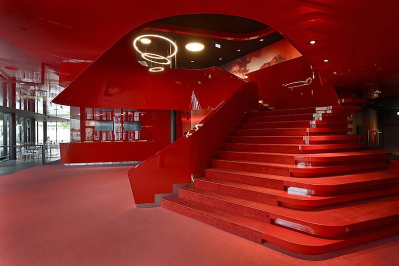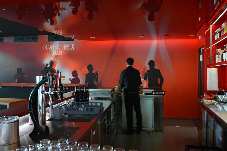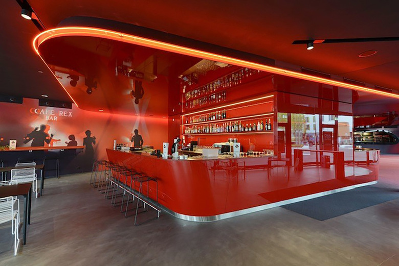 Der Besucher wird von einer inspirierenden Atmosphäre in schwarz, rot und weiß empfangen. Die öffentlichen Bereiche sind um eine komplexe, spiralförmige Form angeordnet, die eine große Treppe bildet, welche die Lounge im ersten Obergeschoss erschliesst. Dieses Volumen in rot definiert räumlich das Foyer, den Kartenverkauf, das Restaurant und die Bar sowie den Zugang zu den Betriebsräumen. Dynamische Formen und Neon-Beleuchtung, inspiriert vom ursprünglichen Kino Rex, lassen einen zeitgenössischen Kino-Ort entstehen, der sich an die Interieurs aus den 1950er Jahren anlehnt. Die renommierte Textildesignerin Claudia Caviezel entwickelte eine grafische Wand- und Bodengestaltung die auf Silhouetten, Filmsets und Farbverläufen basiert und ruft damit die Film Noir Periode ins Leben zurück. Diese Motive geben dem Raum eine emotionale Atmosphäre und bereichern das szenografische Konzept. Der Besucher taucht in eine Welt der Träume und Illusionen ein.