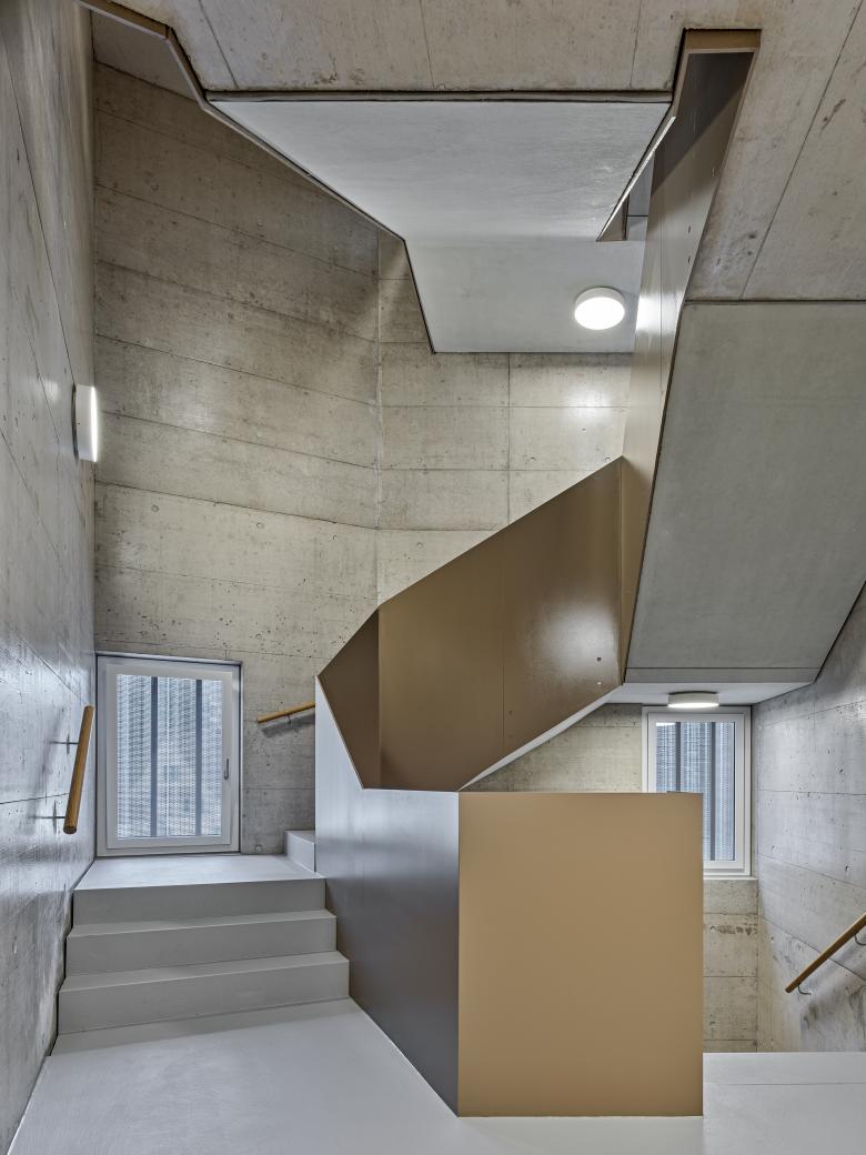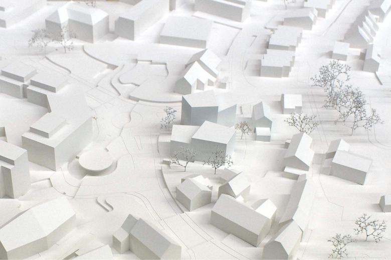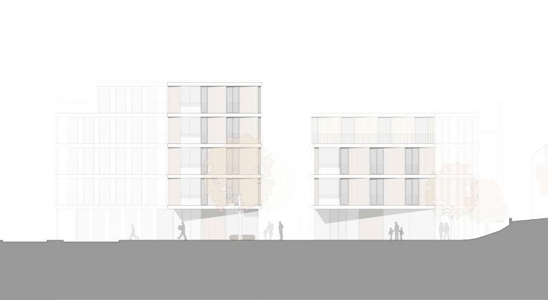 Das Grundstück der Raiffeisen Lägern Baregg, für den Ersatzneubau in Wettingen, liegt an der Zonengrenze zur Dorfzone. Als nördlicher Abschluss der Alberich Zwyssigstrasse entsteht eine markante, dennoch differenzierte Situation mit abgestuften Volumen und einem freundlichen Quartierplatz. Mit der Setzung der zwei artikulierten Baukörper wird eine Transition von den grossen Massen entlang der Landstrasse zur kleinteiligen, organisch gewachsenen Dorfstruktur erstellt. Die Permeabilität und die Höhenabstufung der Gebäudeteile schaffen interessante, visuelle Durchblicke und diagonale Bezüge. Es entsteht ein charaktervolles Ensemble, in dem man leben und arbeiten möchte, eine nachhaltige Architektur, die der Raiffeisenbank als zukunftsorientiertes und vertrauenswürdiges Dienstleistungsunternehmen entspricht.