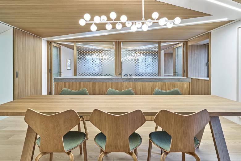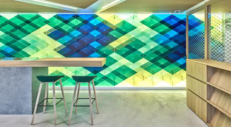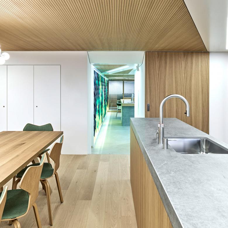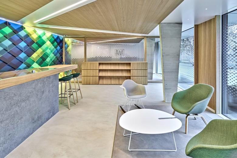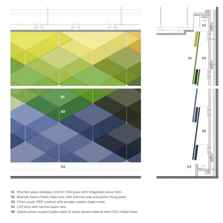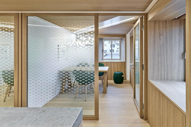 Die Weinbauthematik wirkt als roter Faden und wird differenziert auf die beiden Hauptbereiche der Bank angewendet. Mit der rautenförmigen Glaswand, dem Betonboden und der Holzdecke wirkt die Kundenhalle hell, öffentlich und modern. Als Verbindung zum Hauptsitz in Schaffhausen wird das Konzept der farbigen Glasschindelwand übernommen und am lokalen Weinbauthema angepasst. Diese hinterleuchtete Konstruktion schafft von der Strasse aus einen farbenfrohen, visuell attraktiven Abschluss. In den höherliegenden Stuben, dem ehemaligen Gasthaus, wechselt das Bodenmaterial zu Parkett, die Materialpalette wird von Holz und hell mineralischen Oberflächen dominiert. Rohe Materialien, Holzoberflächen, Textilien und Möbel sollen dennoch eine gestalterische Kontinuität schaffen und beim Besucher einen einheitlichen Eindruck hinterlassen.