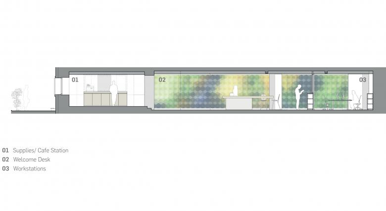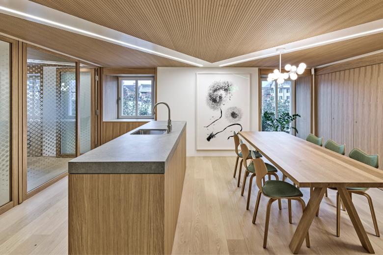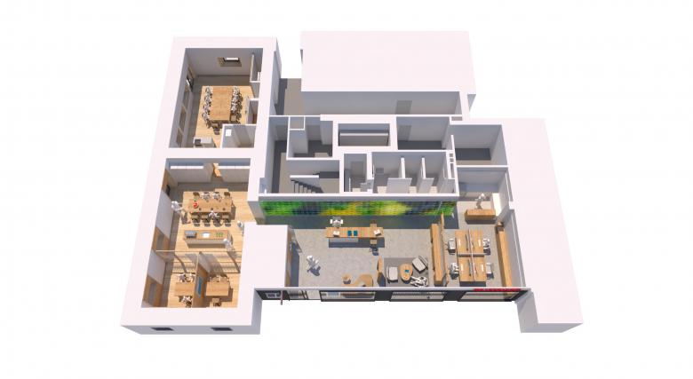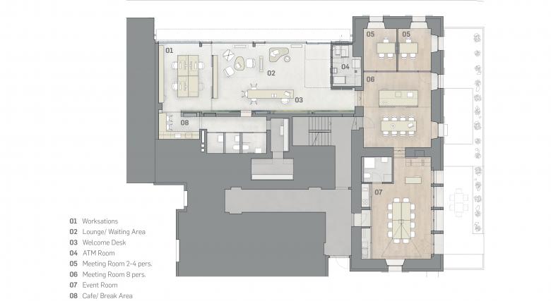 Die neue Geschäftsstelle in Neunkirch, eingebaut in den Räumlichkeiten des ehemaligen Gasthauses Schweizerbund, soll ein zeitgenössisches, flexibles Umfeld für eine moderne Beratungsbank bieten. Die Bank ist in drei Hauptbereiche organisiert. Die Räumlichkeiten an der Grabenstrasse vermitteln das Gesicht der neuen Filiale, sie wirken offen, flexibel und identitätsstiftend. Die angrenzenden Beratungsräume im alten Gasthaus verfolgen hingegen die Idee der ‚Stubenbank’, sie wirken intim, kundennah und gastfreundlich. Der dritte Bereich im südlichen Teil des Gasthauses ist als ‚Add-on’ konzipiert, diese Räumlichkeiten können mit wenig Aufwand als Veranstaltungsraum oder als zukünftige Büroerweiterung genutzt werden.