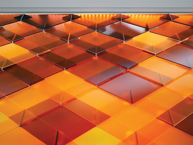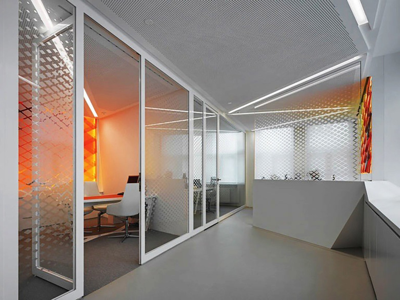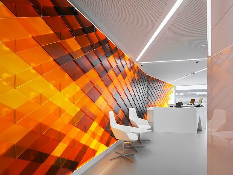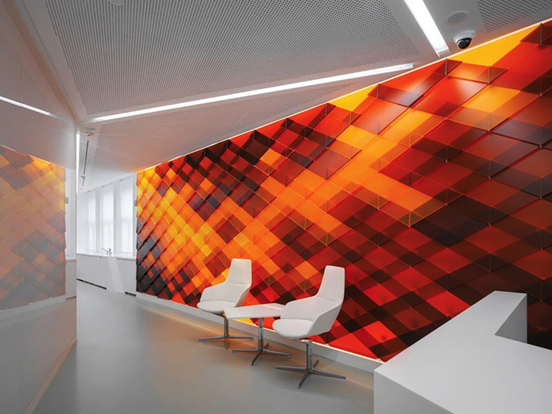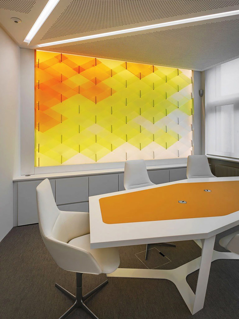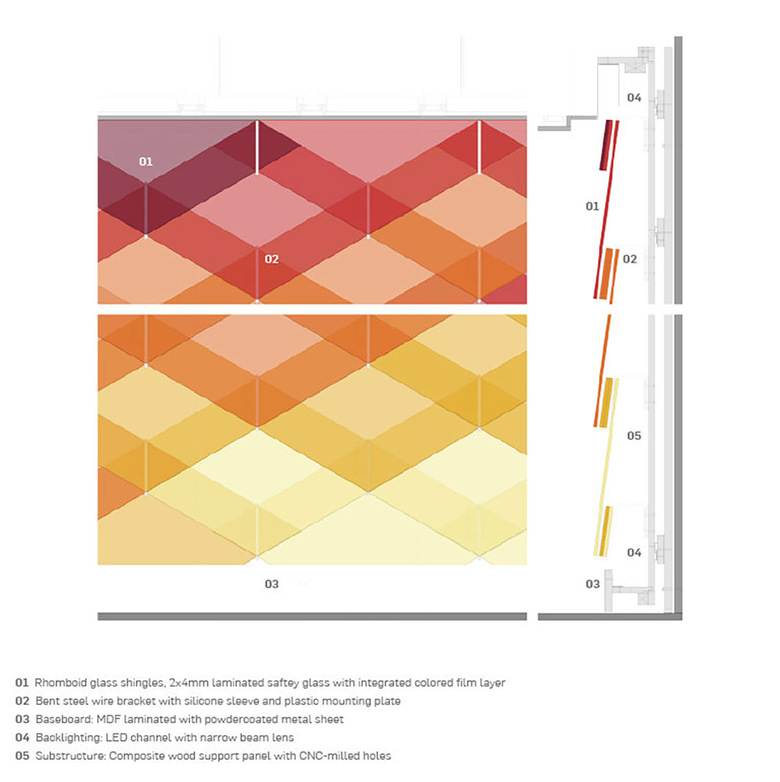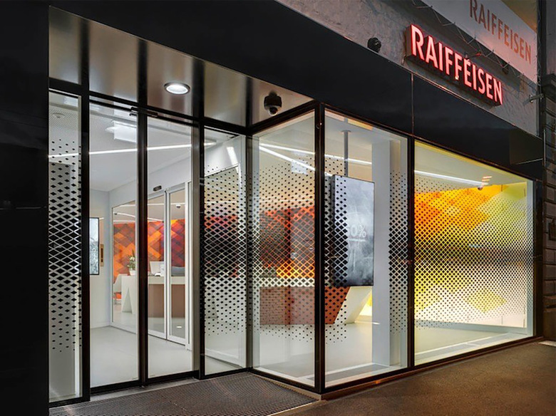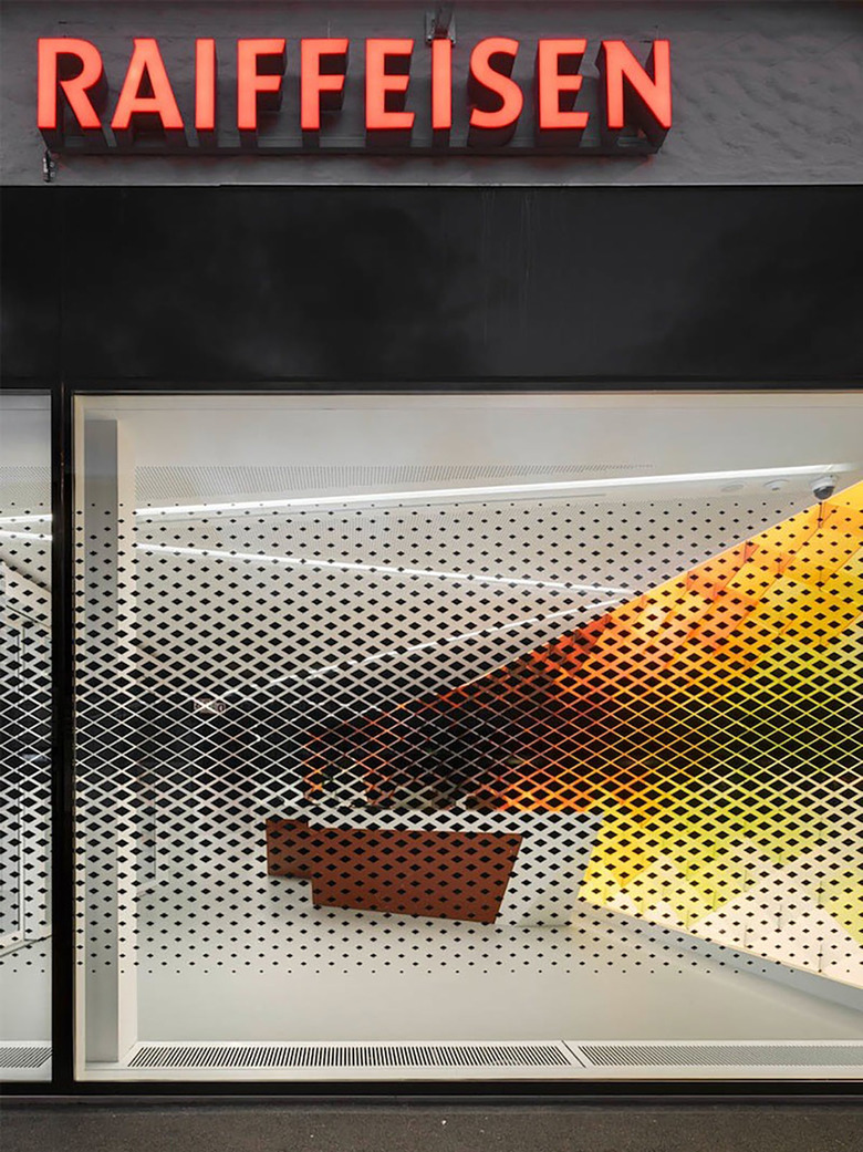 Für die Gestaltung der Kundenhalle greift das Projekt auf die Tradition der bemalten Fassaden in der Altstadt von Schaffhausen zurück, die den öffentlichen Raum prägen. Zusammen mit ROK, Rippmann Oesterle & Knauss, wurden die farbfrohen Wandgemälde in einem digitalen Prozess zu einer Wandgestaltung aus rautenförmigen Glasschindeln für den Innenraum der Bank transformiert. Damit wird sowohl ein Bezug zum ursprünglich wabenartigen Logo der Marke Raiffeisen als auch eine örtliche Verankerung geschaffen. Das Projekt schafft einen subtil gegliederten Raum der Begegnung, welcher mittels Farbgebung, Beleuchtung und Reflexionen das Interesse der Passanten weckt, und den Kunden eine einladende anregende Atmosphäre bietet. Die traditionellen Merkmale der öffentlichen Fassaden werden in den Innenraum transportiert und im Gegenzug öffnet sich die Bank mittels Transparenz zur Stadt.