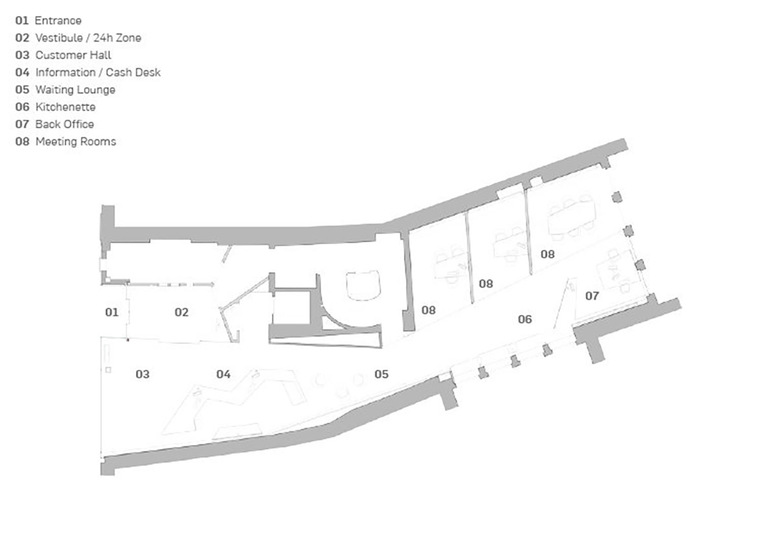 Das neue Erdgeschoss der Raiffeisenbank Schaffhausen ist als grosszügiger, offener Begegnungsraum konzipiert. Die Idee eines fliessenden Bankinnenraums wird in der Tiefe der ursprünglich mittelalterlichen Parzelle umgesetzt. Der Kundenraum erstreckt sich von der Bahnhofstrasse bis hin zum Innenhof und erlaubt somit eine gute natürliche Beleuchtung, eine übersichtliche Orientierung für den Kunden und eine klare Organisation für die bankinternen Abläufe. Der langgestreckte Grundriss wird durch eine zeitgenössische Architektursprache in einer Raumabfolge strukturiert, welche zunehmend nach hinten die Diskretion sichert.