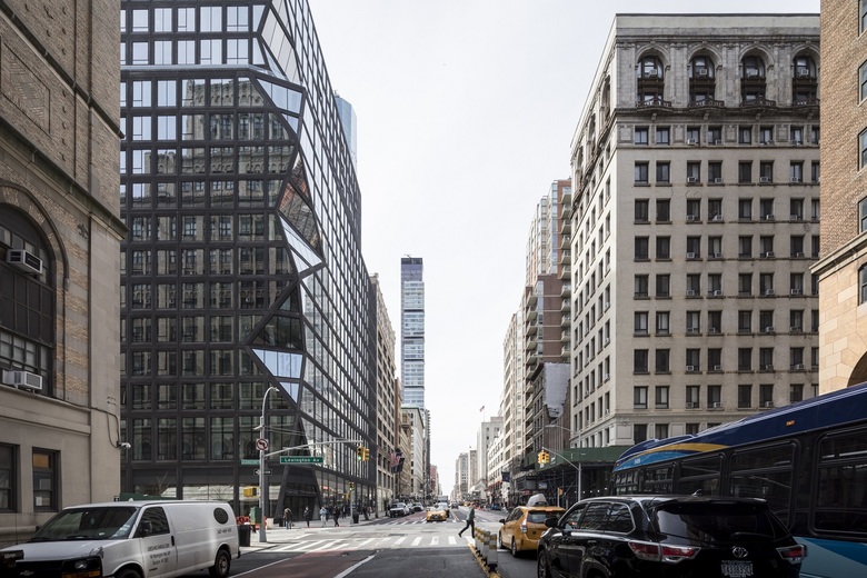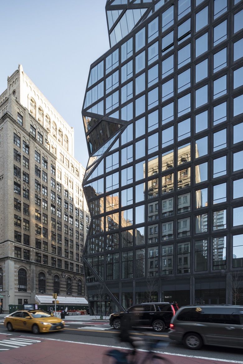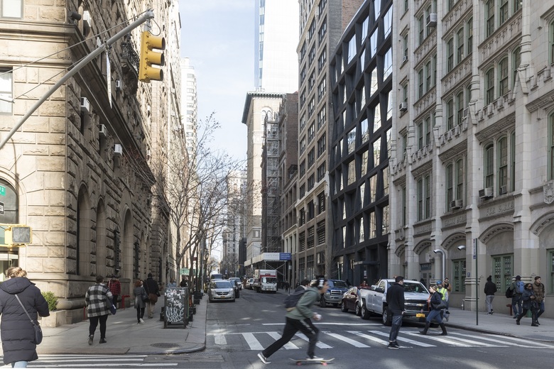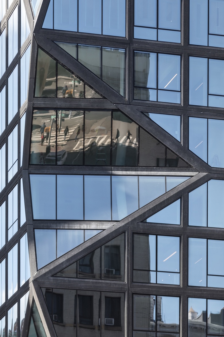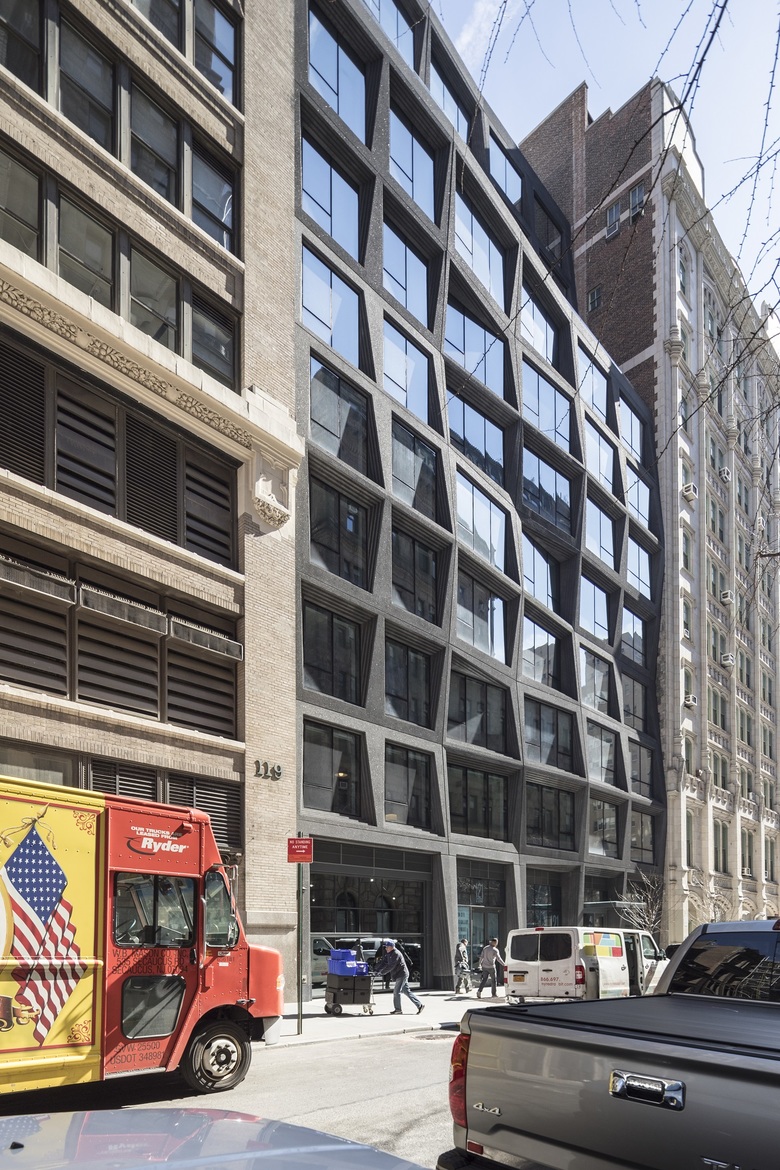 This articulation evokes a collage assembled from various reflections of its surroundings. Vertically, the corner planes bend in and out, creating unique views from the interiors up to the sky and down to the streets. On the street level, the corner is carved inwards, to widen the sidewalk and establish a clear entry point to the ground floor retail. From the expressive corner, the building’s two facades become more contextual as it nears its neighboring pre-war buildings. Its precast panels become bolder as the façade transitions away from the corner, seamlessly establishing a visible gradient from new to historic. The black concrete highlights the windows to accentuate the gradation.