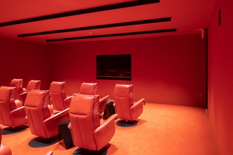 The three-dimensional articulation continues on the 13-story South Tower, which features an undulating grid of punched windows overlooking 22nd Street. The tower houses the main residential entry and a funnel-shaped lobby within leads to an enclosed breezeway and central valley that connect the two towers.