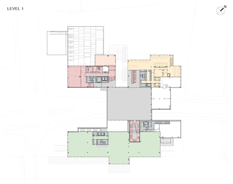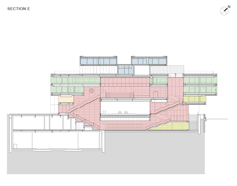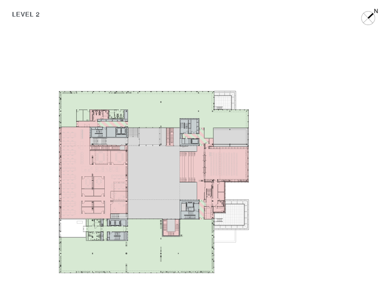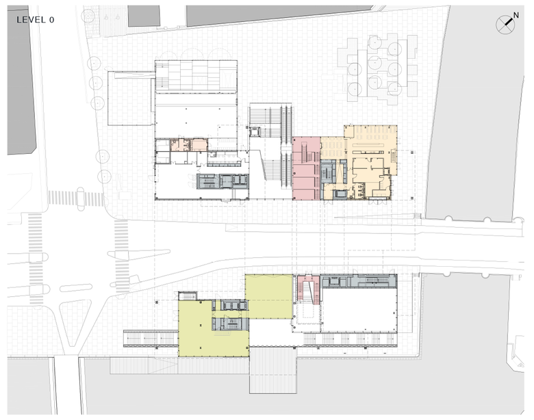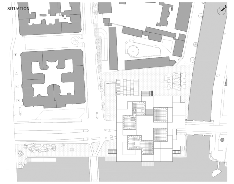 Contrary to most city blocks in Copenhagen – often introverted and inaccessible – the building absorbs the city’s life. The urban routes through the building lead to unexpected and unpredictable interactions between the building and the city, linking the different museums, libraries and historical sites around the culturally rich Slotsholmen area. A linear park along the harbour flows down below water level along the quay wall and through the building. The former playground is incorporated into the new building, as a partially covered and terraced public space, which can be transformed in the evening into an open-air cinema acting as a public foyer.