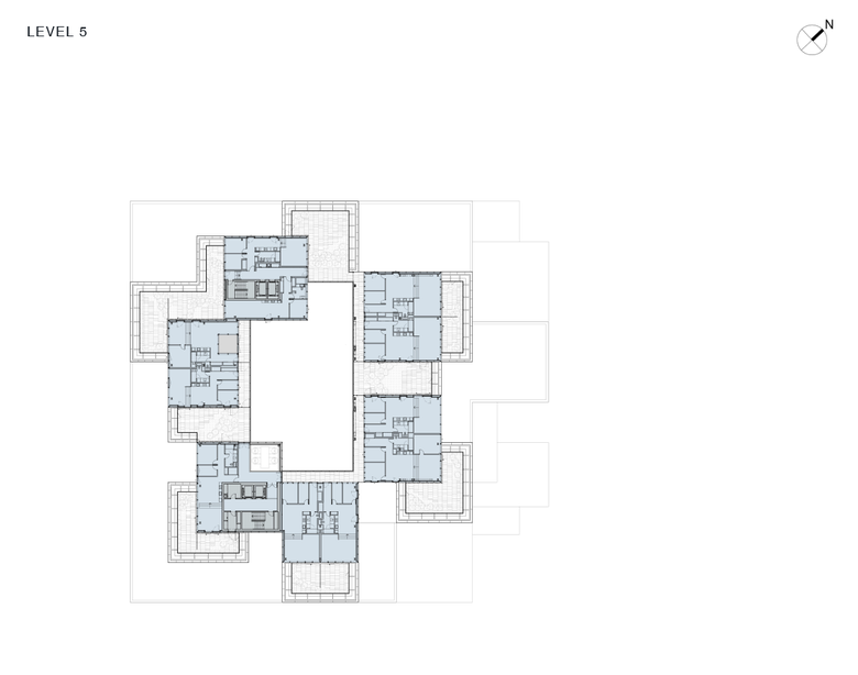 The building’s exterior is marked by a stacking of the same geometric forms in different arrangements. The offices are contained in a rectangular ring of glass facades shaded in a white frit. The ground floor functions are located in separate volumes generating openings which form the public entrances and bring the city in to the center of the building. The apartment volumes are fragmented and recessed for privacy, the landscaped terraces encircle the DAC’s central rooflight. The building’s coloured textures subtly echo the sea tones of the harbour, ever-present in the reflected light of the water.