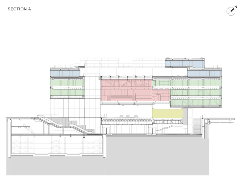 The DAC itself forms the core of the BLOX Project, positioned in the centre, surrounded by and embedded within its objects of study: housing, offices and parking. It is organized as a vertical sequence of spaces running through the building, starting below ground and moving upwards to the cafe with its view over all of Copenhagen.