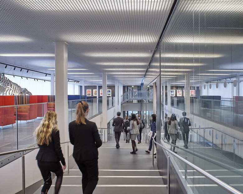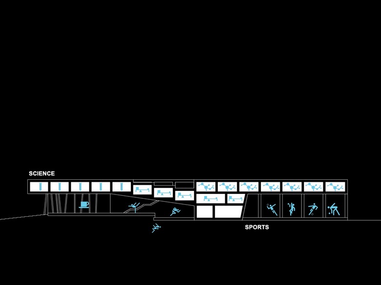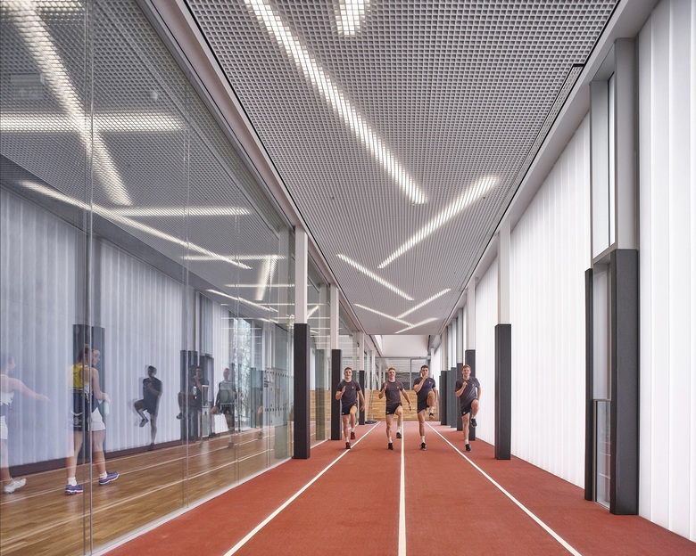 The School of Science and Sports at Brighton College defies the conventional character of educational buildings – one of endless empty hallways and imposed silence – and instead combines the two departments to create a vibrant building with lively spaces where activities are not necessarily dictated by a school timetable. Observing that processes of learning take place outside as much as inside of the classroom, the design articulates a new idea of educational space bolstering interaction and exchange.