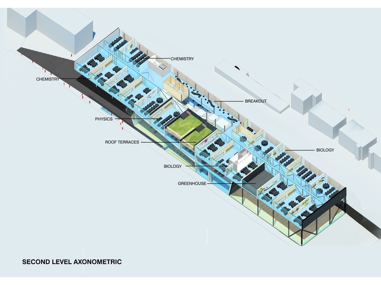 Stimulating social communications between the students was central in the concept: generous and open break-out space outside of the classrooms create room for informal interaction and private studying. Level shifts, grand staircases and glass visually connect the activities taking place in both departments and trigger unexpected exchanges between different disciplines. Individual components of the building are exposed to each other: an indoor running track on the ground floor is visible from upper levels, classrooms have floor to ceiling windows, even fume hoods in the chemistry classrooms are made transparent – enabling people walking down the hallway to witness ongoing experiments.
