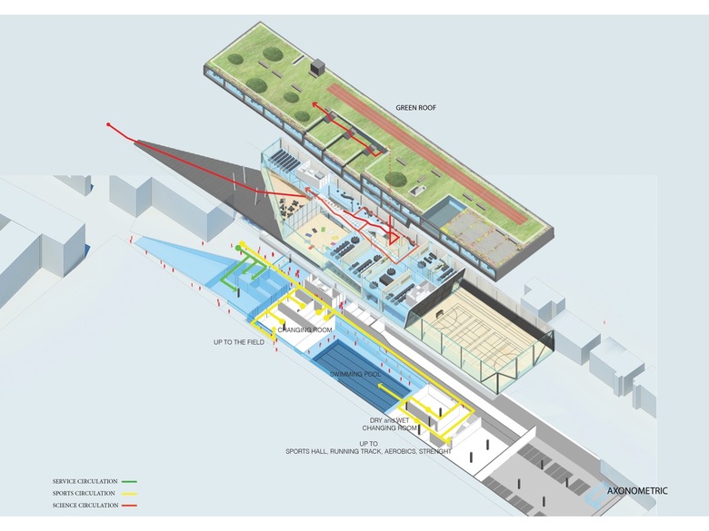 OMA was awarded the project after a competition organized in 2013, when Brighton College needed to expand the Science School in terms of number of labs, and wanted a state-of-the-art sporting facility to foster talent and physical wellbeing. In the original competition brief the Sports Center and Science Department were presented as two separate projects. After a revised brief in 2013, and a second competition phase in 2014, planning approval was acquired in 2015 and construction started in 2017. The project was realized with a total construction budget of £36,700,000.