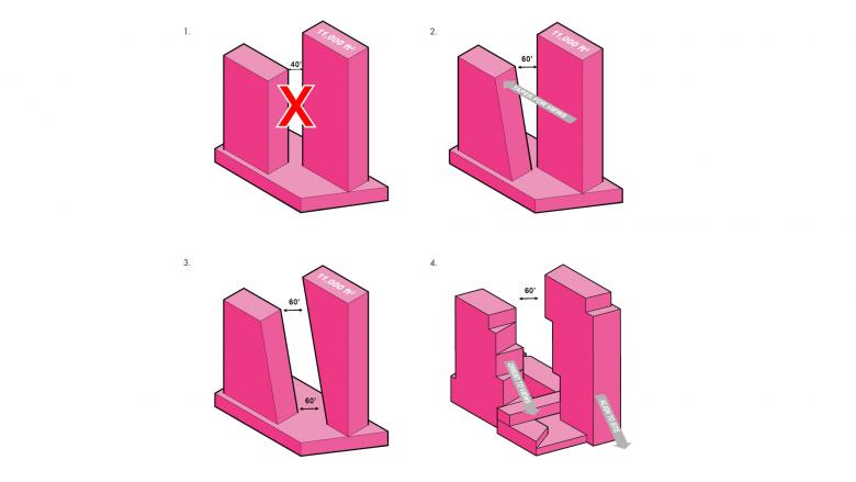 The zoning allowed for a maximum floor plate of 11,000 square feet. We quickly found that this scale and required setbacks would result in only 40 feet of separation between our two towers—an uncomfortable proximity that undermined the potential of the site and would create a wall from the neighborhood. We began by reducing their footprints to allow for 60 feet of open space, more akin to the scale of a typical street. We could then strategically expand and contract the towers for zones of maximum efficiency within each.
