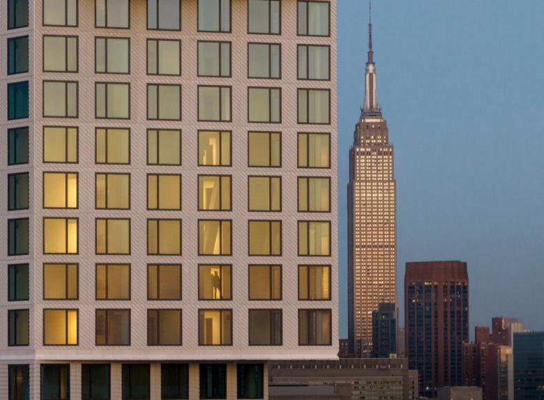 While The Avery’s glass curtain wall was rising in San Francisco, our proposal here sought to embrace solidity. Incorporating large 8-foot-by-8-foot windows into a grid of precast concrete maintains expansive views while making the complex negotiations between unit interiors and facade easier to accommodate. The solidity also creates a set of buildings that emerge more seamlessly from the neighborhood. Much like the shingled facades seen on Greenpoint’s townhouses, the precast panels are carved by a series of angled planes. The shingling of each “block” of the tower alternates in orientation to emphasize the finer scale of the towers’ mass—a dynamic relief that reacts to the movement of the sun.