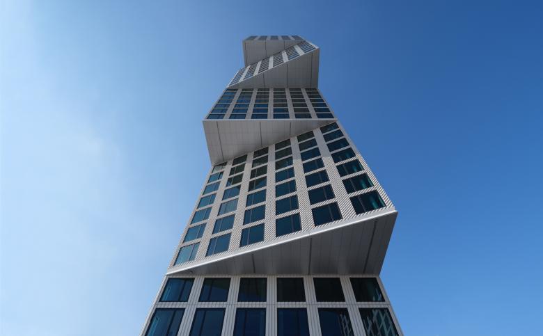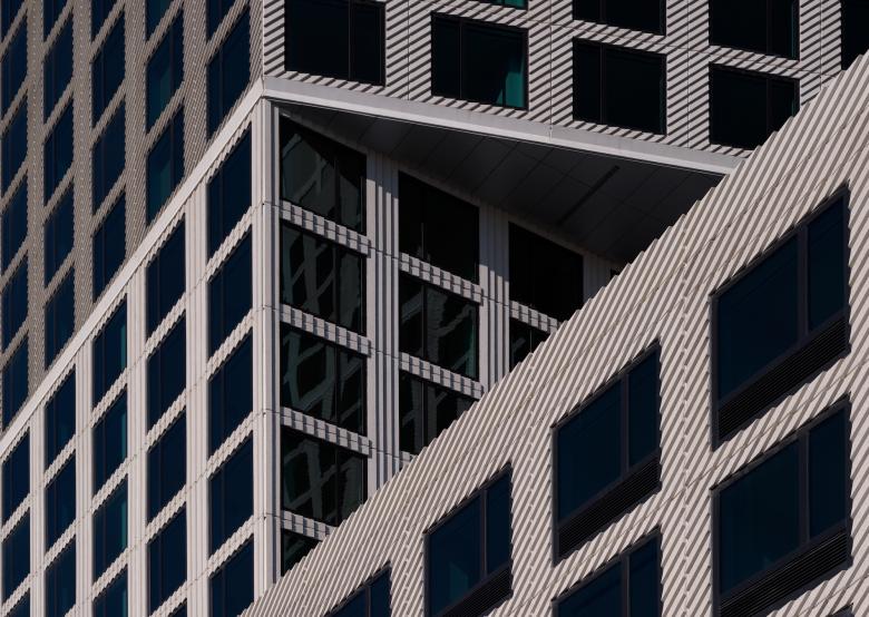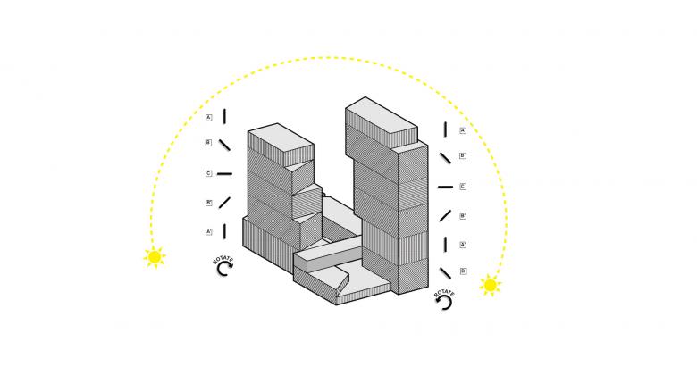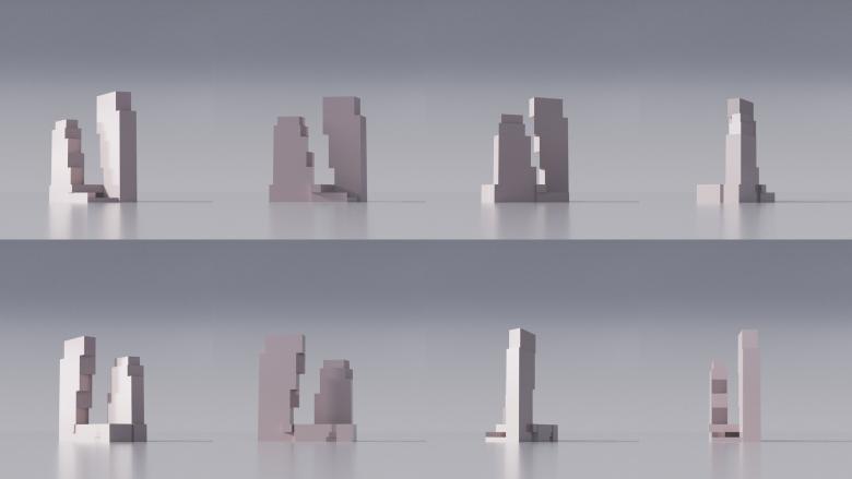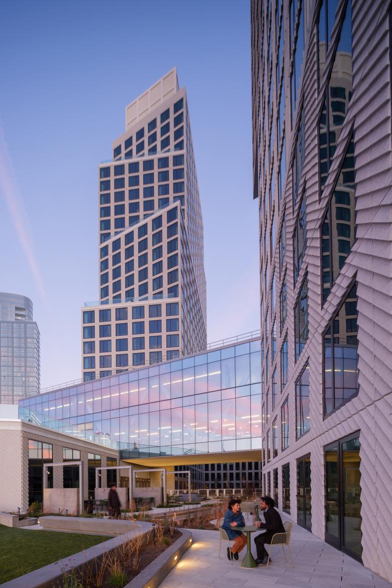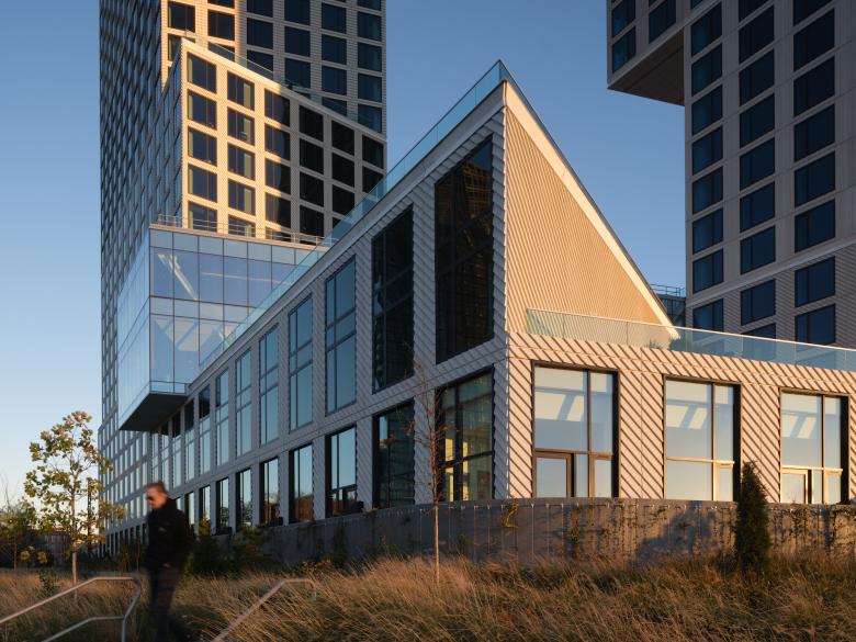 The two towers simultaneously lean into and away from one another. The taller tower widens toward the east as it rises, maximizing views and creating a dramatic face to the neighborhood. The shorter tower, a fraternal twin, widens toward the ground to face a new waterfront park to the north. The two towers are shaped to create terraces and overhangs that emphatically link them together as if they were broken apart from a single block. A ziggurat and its inverse, the pair are distinct yet intimately connected by the void between them. The stepped forms of the towers and the articulation of their facades mediate the inevitable contrast in scale between the two towers and the existing neighborhood. The stepping divides the tower into seven- to eight- story blocks that echo the scale of the neighboring buildings. The facade reinforces this subdivision.