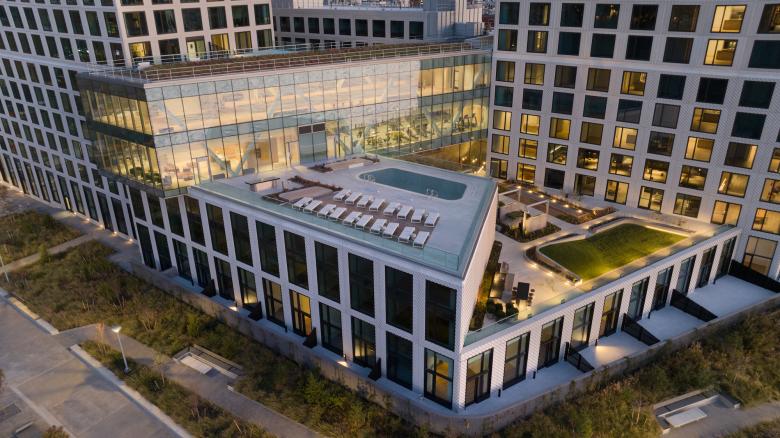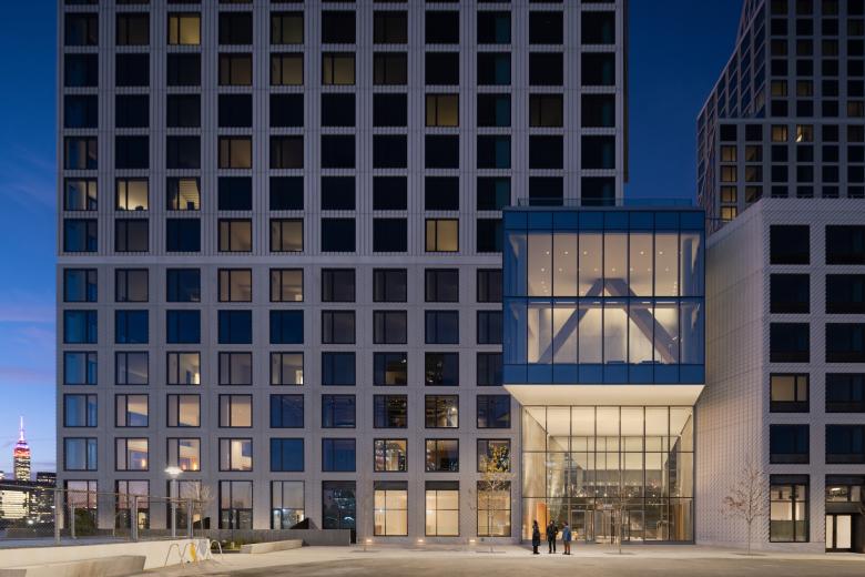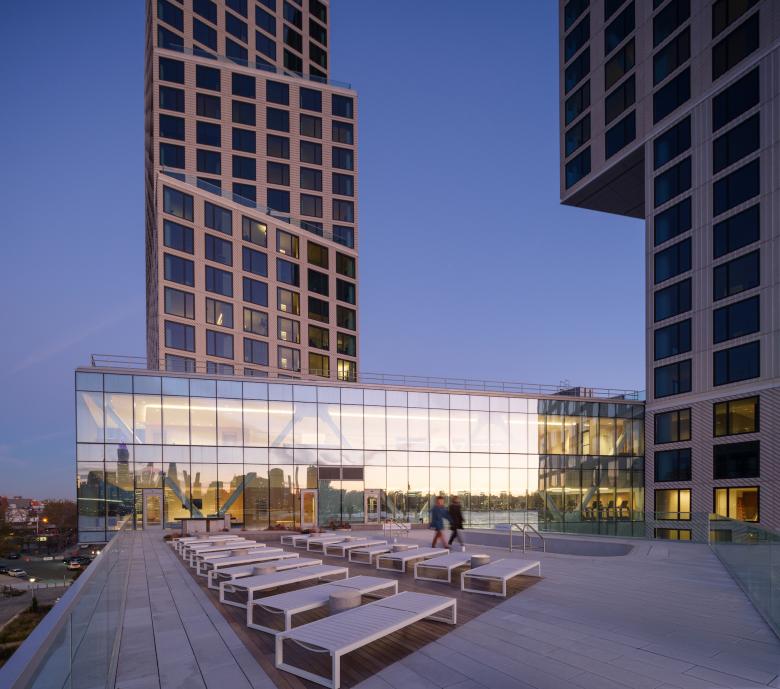Echoing Greenpoint’s pastoral origins as a neighborhood of family farms, two levels of green space open to the waterfront. Terraces are framed by a collection of common spaces. Above them, the towers are linked by an amenity bridge looking over the Manhattan skyline. Altogether, Greenpoint Landing aims to be a platform for living: connecting past and future, indoor and outdoor, urban streetscape and waterfront.