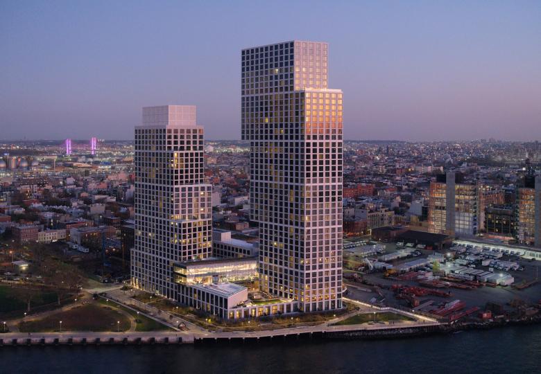 As part of a sweeping rezoning of both Greenpoint and Williamsburg in 2005, our site and blocks to the north and south were identified as an area for new residential density—introducing pairs of thirty- and forty-story towers to include market-rate and affordable housing (30 percent of units to be affordable). In exchange, this new development would open access to and along the East River. Our site sits at the conjunction of Greenpoint’s primary grid and a secondary grid that extends perpendicular to Newtown Creek. This hinge- point provides panoramic views of Manhattan, but also cuts the western end of the site, creating a trapezoidal outline and constraining the size of the block. Our challenge was to fit the desired amount of housing into a site and a neighborhood that both seemed too small to accommodate it.