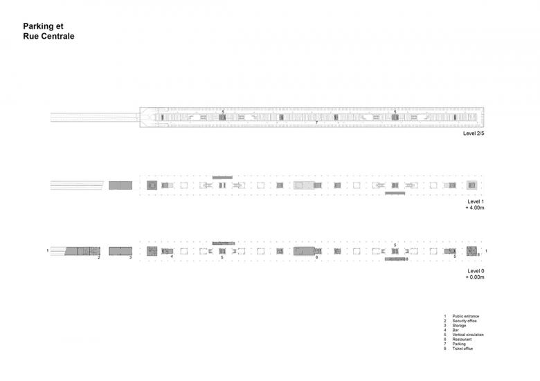 Elevated above the Rue Centrale and directly accessible from it is the carpark, a four-story elevated silo that sits right in the middle of the project. This building functions as a ceremonial entrance directly into the heart of MEETT, connected to the exhibition areas. It is an open building, to maximize the use of natural light and allow views into the expos from the parking lots.
