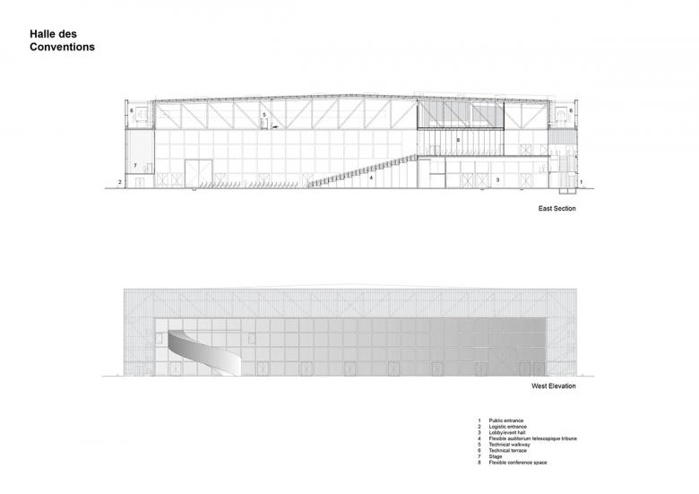 The Event Hall and Convention Center building is designed as a machine. A system of moveable vertical shutters and horizontal partitions allows it to transform in few minutes into a large number of configurations, from small meeting rooms in the upper floors of the Convention Center to an open plan layout bathing in natural light on the ground floor.