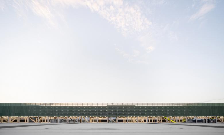 MEETT is conceived as an active strip – ‘une bande active’ - a horizontal and compact project, divided in three parallel bands: a row of modular exhibition halls to the north; a convention center and multi-function event hall to the south; and a reception area to the center, featuring a silo car park for 3,000 cars. Instead of banishing parking underground or pushing it to the periphery of the site, where it has no relationship with the surrounding landscape, we placed the parking at the center of the project, covering a spine where amenities and access to the hall are concentrated.