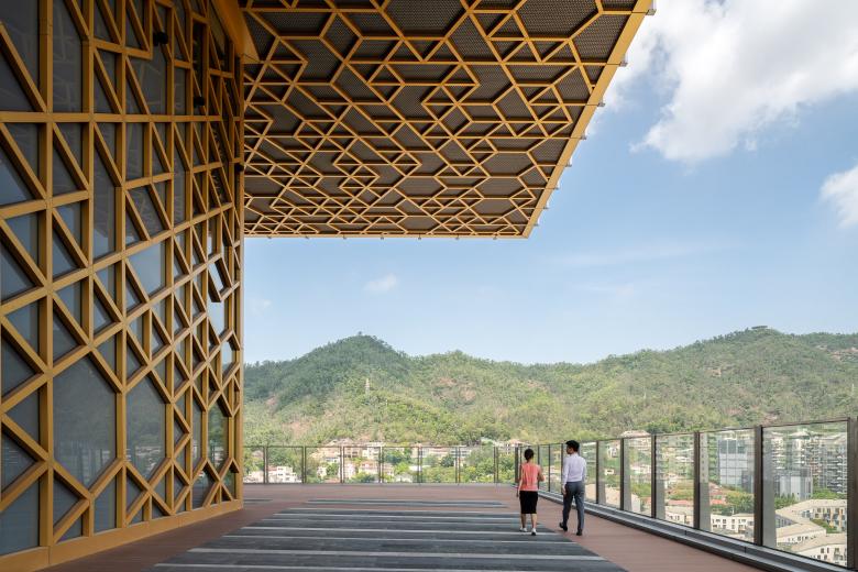 The site falls on Shekou’s most prominent view corridor that runs from the mountains to the sea. Prince Plaza takes full advantage of the view corridor without obstructing it. The tower is an ensemble of four bars attached to a central core. Three sky decks—highlighted by a hexagon-patterned facade inspired by hills and waves—are viewing platforms open to vistas of the mountains and the sea. Designed for use by both tenants and public, they add to the collection of the public outdoor spaces in the coastal Sea World district.