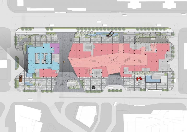 A 40,000 m2 podium mall occupies the full length of the orthogonal site to maximise street level retail frontage. Different than typical enclosed shopping malls, Prince Plaza’s podium mall has a porous façade and a roof terrace— an extension of the existing commercial and recreational offerings of the Sea World district. A prominent opening— marked by a similar façade as the sky decks—is created at the location through which the view corridor runs. Underground levels of the mall are integrated with two metro lines that connect Prince Plaza to the rest of Shenzhen.