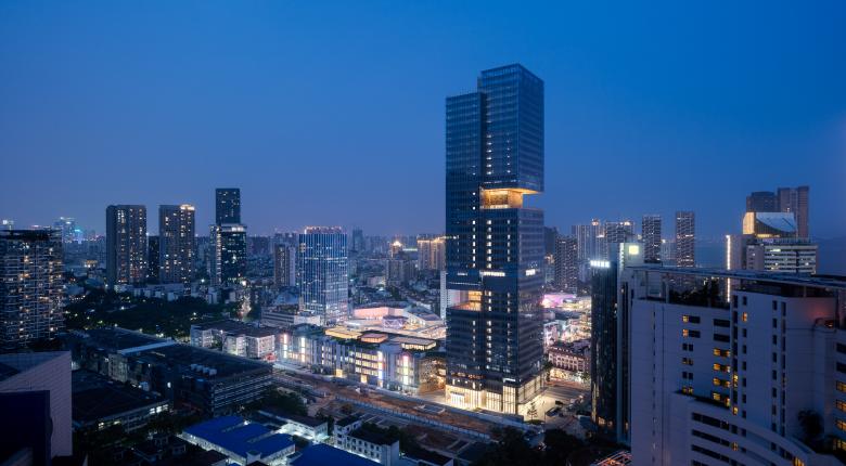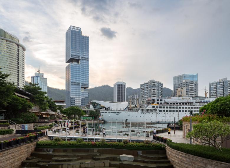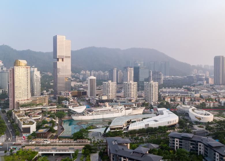 Shekou is defined by a mixed landscape. Mountains and sea, an industrial fabric from the early economic reform era, and recent skyscrapers form a dynamic context. Prince Plaza is located in Shekou’s Sea World district—a unique coastal zone in Shenzhen backed by the Nanshan Mountains and facing the Shenzhen Bay, abundant in public outdoor spaces. The 200-metre mixed-use podium tower at once connects with Shekou’s latest commercial developments, its industrial past, and its everlasting natural environment.