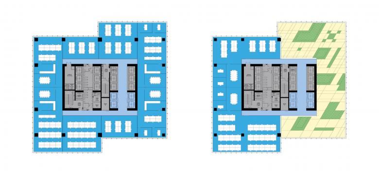 The sky decks break down the otherwise monolithic 60,000 m2 tower into four bars of different sizes that respond to architecture of distinctive scales in the surroundings. The two bars on one side are slightly set back to increase the perimeter or each floor plate, allowing more natural light into the office space. The tower’s fluted façade, with extra wide glass panels, enable office tenants to visually connect with the mountains and the sea, while further bringing lightness to the slender vertical bars.