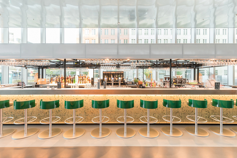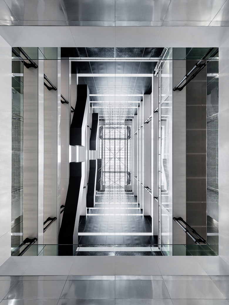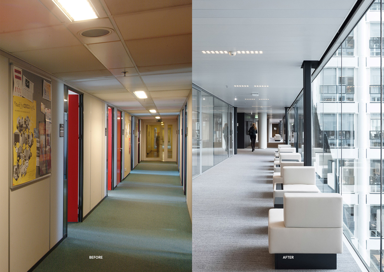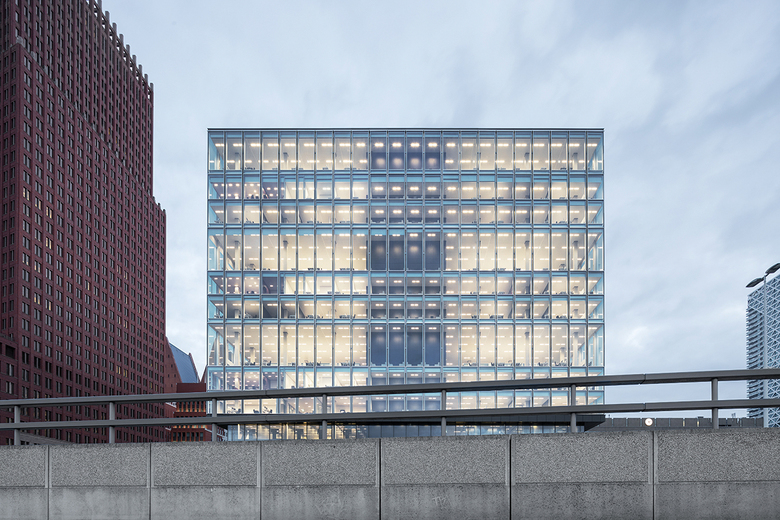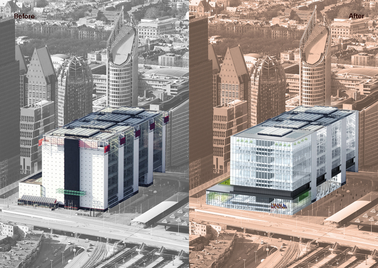 OMA’s design gives the building a new relation to the city of The Hague, connecting it to the city, both visually through a large new glass facade, and functionally through the creation of a new, enlarged passage that acts as a public square, from which the main entrances to Rijnstraat 8 are clearly recognizable. The introduction of open plan offices helps reveal the building’s internal processes. A new walkway running the entire length of the building improves one’s sense of direction and provides each floor with a view to the city. The central conservatory space, surrounded by administrative squares and office landscapes on double height floors, enables a variety of meeting and work spaces and facilitates flexible ways of working which require less office space.