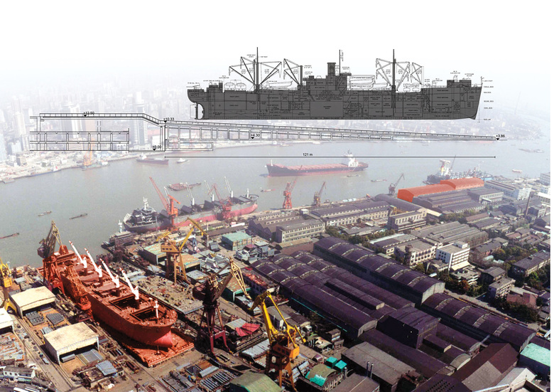 The Lujiazui Exhibiton Centre is located on the northern and most recent development of Shanghai Pudong, along the Huangpu River, one of the most photographed waterfronts in the world. The project site, occupying the former ‘Shanghai Shipyard’, has a long history of marine industry. The new Exhibition Centre is positioned on the ramp of a former ship cradle and provides a concentrated event space within the surrounding financial district.