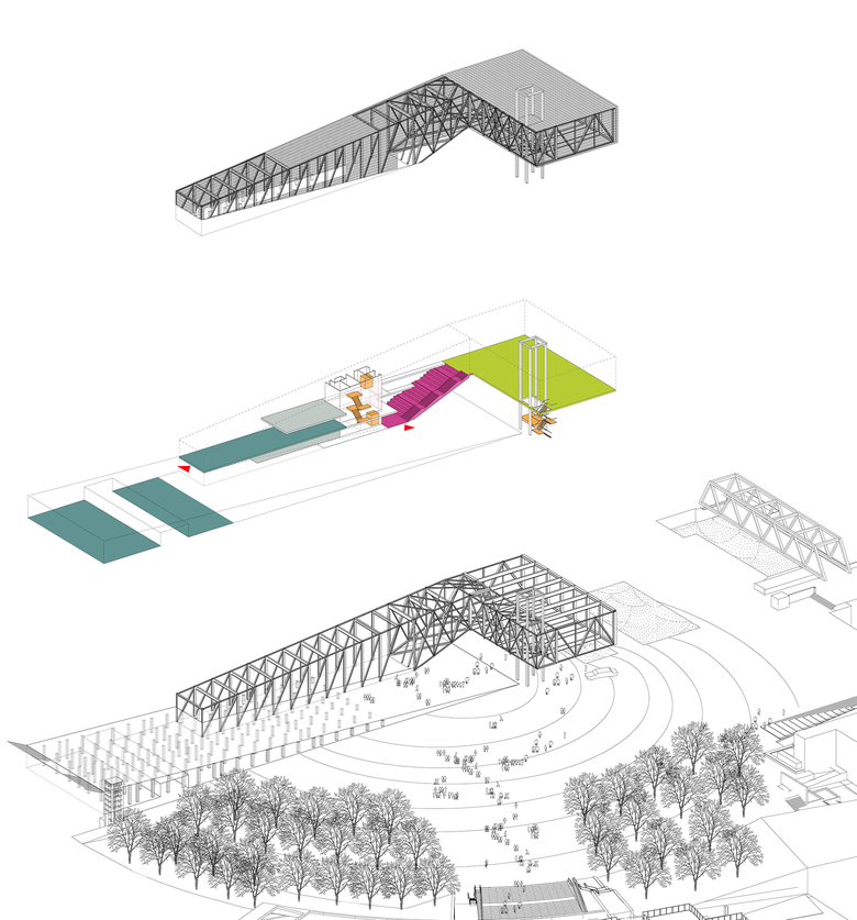 OMA conceived the Exhibition Centre as a “spatial armature,” suspended above a plaza and connected to another exhibition space beneath the ramp. The building organizes the open space, adding new programmatic opportunities for film screenings, fashion shows, and concerts. The new volume transforms the existing ramp into a large-scale theatrical space for events while the covered plaza under the elevated box can be used for more intimate happenings.