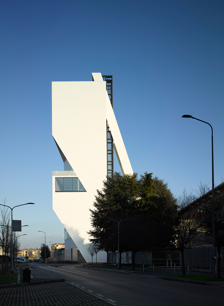 Its rectangular plan is constructed on a wedge-shaped site, on the North-West corner of the Fondazione; the tower consists of alternating blocks of wedge-shaped-plans and rectangular floors that are cantilevered over Milan’s public space.
