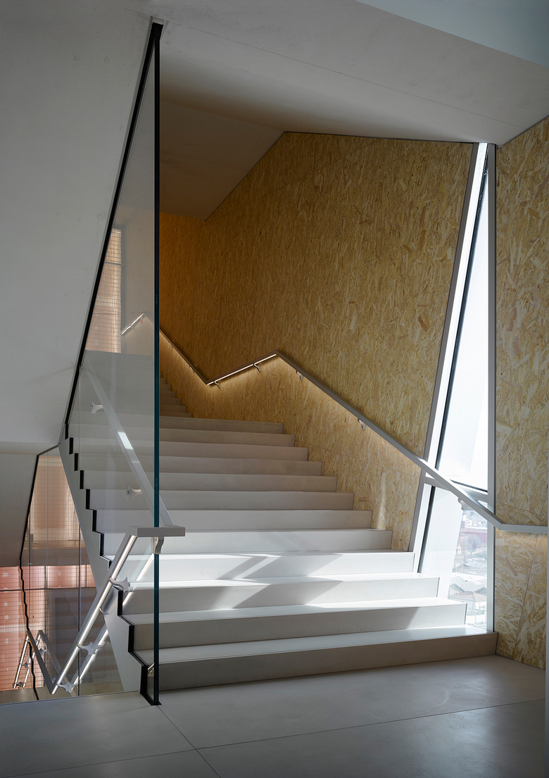 At the rear, a diagonal structure emerging from the vastness of the Deposito pulls the tower back. To extend the typologies offered by the Fondazione, a series of systematic variations is applied: each next floor is taller than the previous one, rectangular plans alternate with wedge shapes, the orientation of the rooms alternates between panoramic city views to the North, or narrower views in opposite directions, East and West.