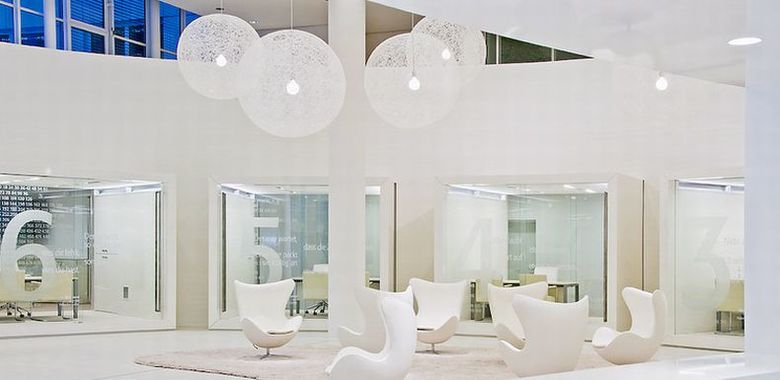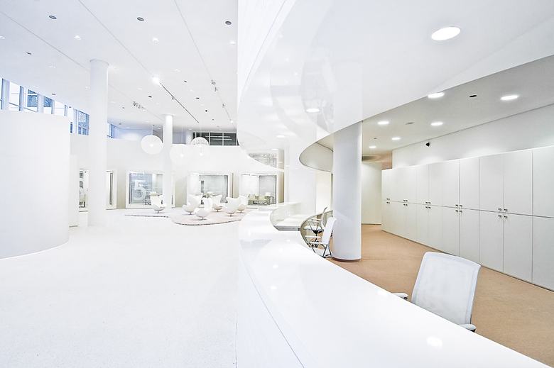 Neugestaltung der alten Eingangshalle zum repräsentativen Kundenforum. Ein dynamischer Wandschwung zentriert das Erdgeschoss zur kreisrunden Piazza.Mittendrin der Kunde, umgeben vom Empfangsbereich und transparenten Beratungskuben, im Verborgenen dahinter das BrokerCenter mit Backoffice. Die Raumstimmung in homogenen Weißtönen unterstützt mit einer klassisch anmutenden Licht – Schatten Wirkung die bewegte Linienführung.