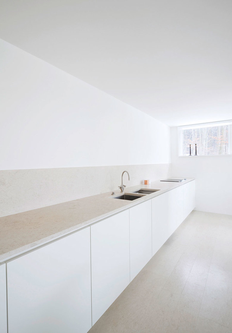 Der Auftrag für dieses Privathaus in Kronberg bestand aus einer maßgeschneiderten Küchenzeile. Eine ästhetisch reine und funktionierende offene Kücheneinheit wurde entworfen, um die bereits im Raum verwendeten Materialien anzupassen und ein beruhigendes Element zu erzeugen, das an die Wohnbereiche angrenzt. Im Rahmen dieses Konzepts werden alle Geräte hinter Türen verborgen.