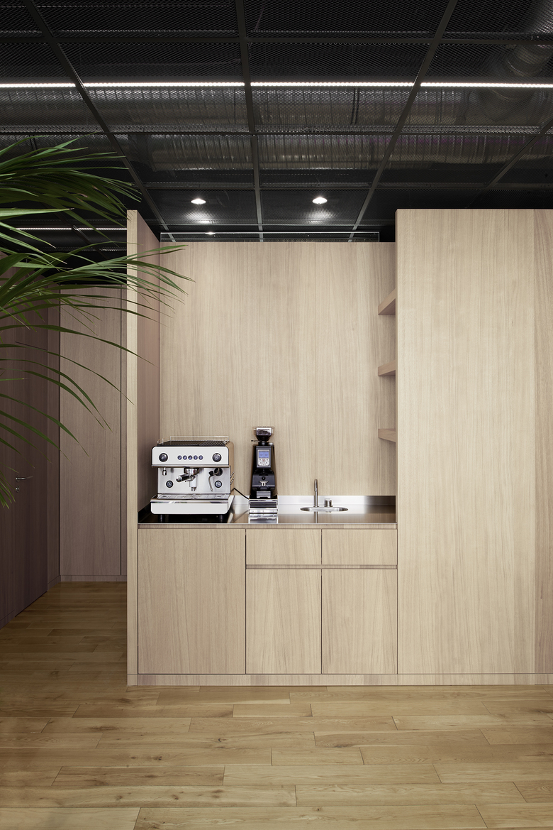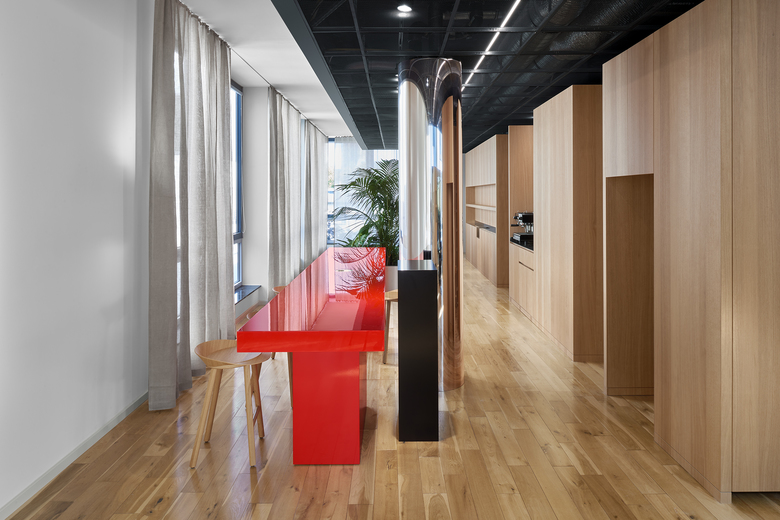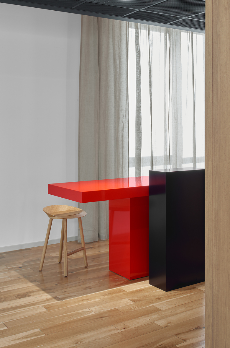 Hochwertige Materialien und funktionaler Glamour stehen im Mittelpunkt des Designkonzepts, das den Kunden auf eine Entdeckungsreise entführt. Eingebaute Wandpaneele aus Eichenfurnier strukturieren den 225 qm großen Grundriss und schaffen individuelle Arbeitsbereiche. Skulpturale Elemente wie der schwarze kubische Empfangstresen, übergroße Pflanzgefäße oder der rot glänzende Schreibtisch setzen individuelle Akzente.