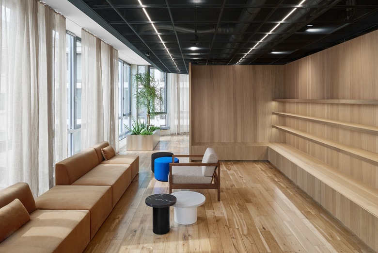 Warme Materialien wie der Boden aus Eichenholz oder die Holzverkleidung, die die Küche und die Toiletten in der Mitte des Gebäudes geschickt abdeckt, werden von futuristischen Elementen wie dem Edelstahlplateau für den Waschbereich und dem roten Tisch in der Wartezone kontrastiert. Letzteres ist nicht nur ein farbiges Highlight, sondern integriert auch Kabel und technische Komponenten, die den Tisch zu einer Ladestation für Elektrogeräte machen.