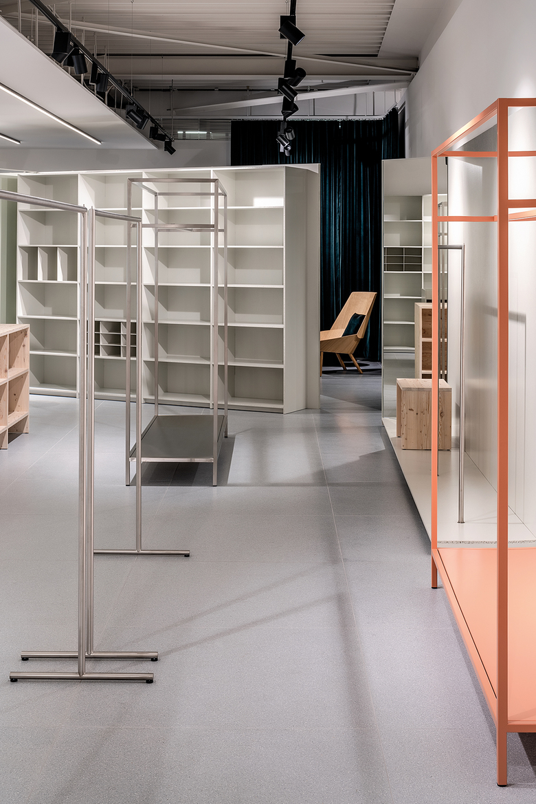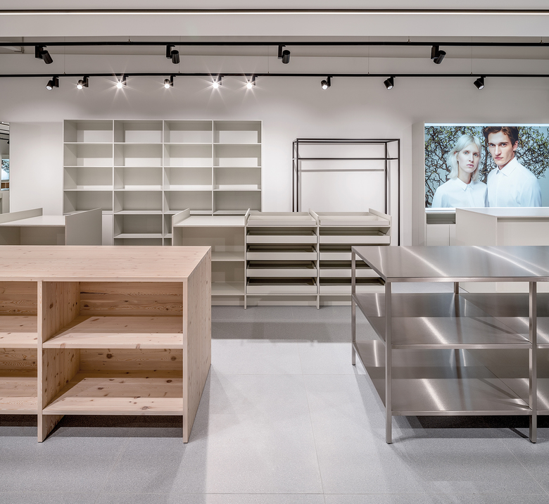 Eine sorgfältige Kombination verschiedener Materialien führt zu einem faszinierenden Raumerlebnis. Auf einem hochwertigen Terrazzoboden stehen Regale und Präsentationseinheiten aus Spanplatte mit transluzentem Graulack. Spiegel kontrastieren die Spanplatte und schaffen faszinierende Blickwinkel. Präsentationseinheiten aus Massivholz werden wirkungsvoll mit Einheiten aus Edelstahl kombiniert, die einen industriellen Charakter vermitteln, der an die industrielle Produktion erinnert, die Seidensticker in den 1950er Jahren populär machte.