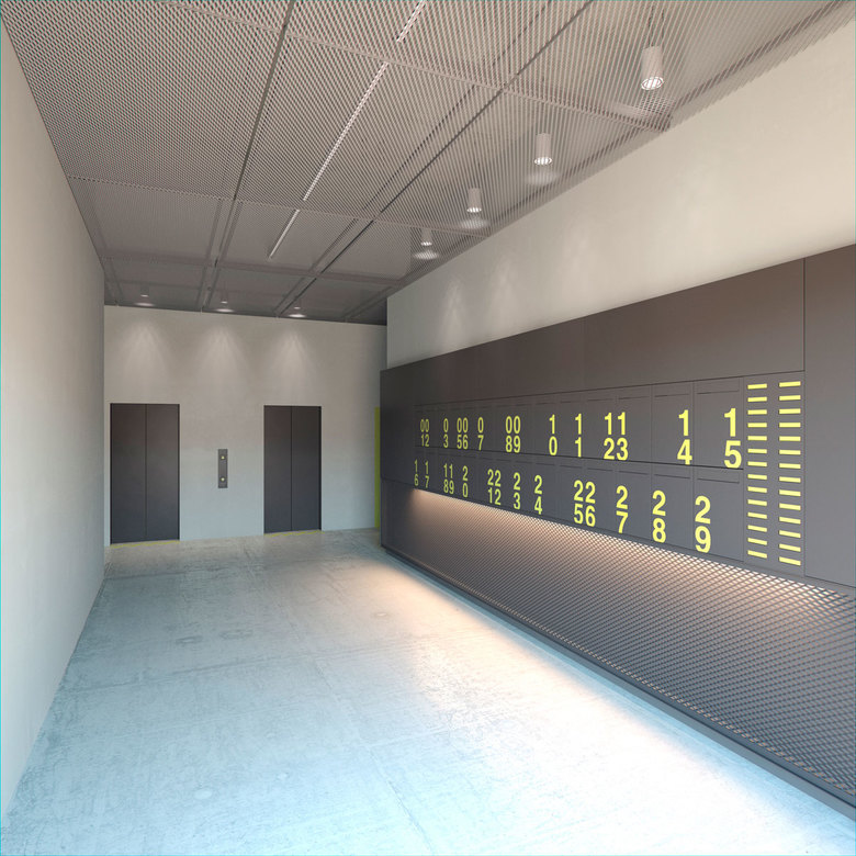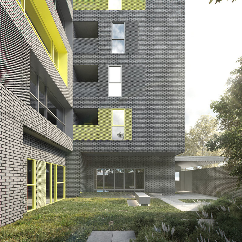 Mit dem Ziel eine moderne und gleichzeitig unkonventionelle Fassade zu kreieren, die sich von der Umgebung abhebt, wurde eine Fassade in Backsteinoptik aus speziell entwickelten, extrem wetter- und erosionsbeständigen Fliesen entwickelt, die die drei Gebäude umschließt. Farbiges Steckmetall verbindet die Fensterelemente und strukturiert die Fassade. Die Farbe der Fensterrahmen korrespondiert mit der Farbe des Streckmetalls und schafft in Kombination mit der hellgrauen Backstein-Struktur einen harmonischen und gleichzeitig dynamischen Ausdruck. Die Farbpalette sowie die Metallelemente der Fassade setzen sich im Innenraum fort, der auf diese Weise den gleichen dynamischen, authentischen und frischen Charakter der Fassade ausstrahlt.