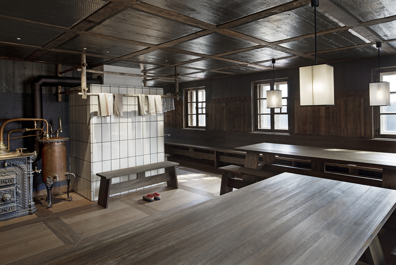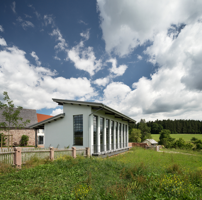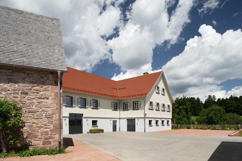Wechselspiel aus geschindelten und verschalten Holzfassaden, verputzten Wandflächen und kleinteiligen Stahlfenstern sowie großflächigen Glas- und Stahlelementen bilden die Grundlage für das Fassadenkonzept des Ensembles. Neben dem Einbau einer neuen Beleuchtungsanlage, reduzierte das Büro PHILIPP MAINZER Details in den Innenräumen auf das Nötigste und schuf so geradlinige Strukturen und Oberflächen, immer unter Bezugnahme regionaltypischer Fertigkeiten.