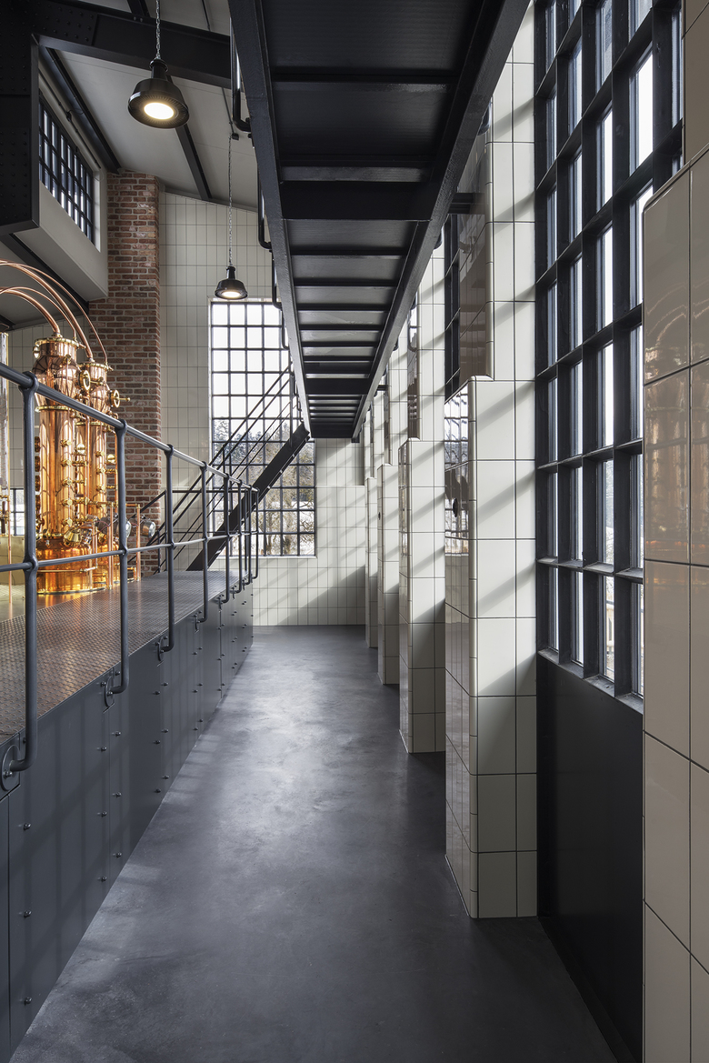 In dem 150 qm großen Brennereigebäude herrschen die Materialien Edelstahl, Kupfer und Messing vor. Das Brennereigebäude besitzt extra hohe Wände und beherbergt das Herzstück der Monkey 47 Schwarzwald Destillerie: Die maßangefertigte Brennereianlage des deutschen Kupferschmiedes Arnold Holstein. Große Stahlfenster sorgen für ausreichend Tageslicht und erlauben einen großartigen Ausblick in das Tal und die umliegende Landschaft.
