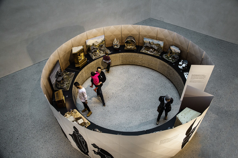 Die minimale Konstruktion und die Verwendung von ausschließlich wiederverwertbarem Material tragen sowohl ökonomisch als auch ökologisch der kurzen Ausstellungsdauer von 6 Wochen Rechnung. Gekantetes Material umschließt das kreisrunde Ausstellungspodest und schafft einen intimeren Ausstellungsraum inmitten des 23 m hohen Atriums.