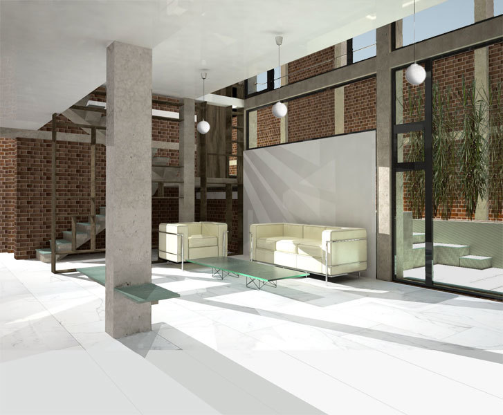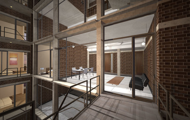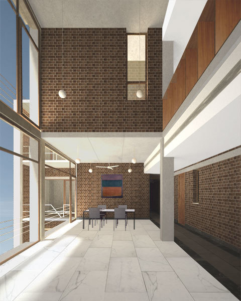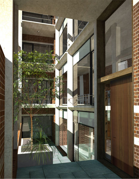 The site for this residence is in South Delhi, on a plot sandwiched between two existing houses. The challenge was to develop three separate apartment units of approximately of 10,000 sq. ft. total built up area while ensuring adequate light, ventilation and open, green spaces for all units. A landscape courtyard was sculpted out of the earth towards the south allowing the winter sun to penetrate into the living areas while floor to ceiling glass allows the indoor spaces to flow out into this green court. The building is designed as a load bearing exposed brick structure with flat slabs. This makes the construction process simpler and faster while allowing for larger volumes and an effortless aesthetic. The spaces ofare organized along a linear gallery that’s forms the spine of the building, providing for efficient circulation as well as the zone through which all services are carried and distributed.