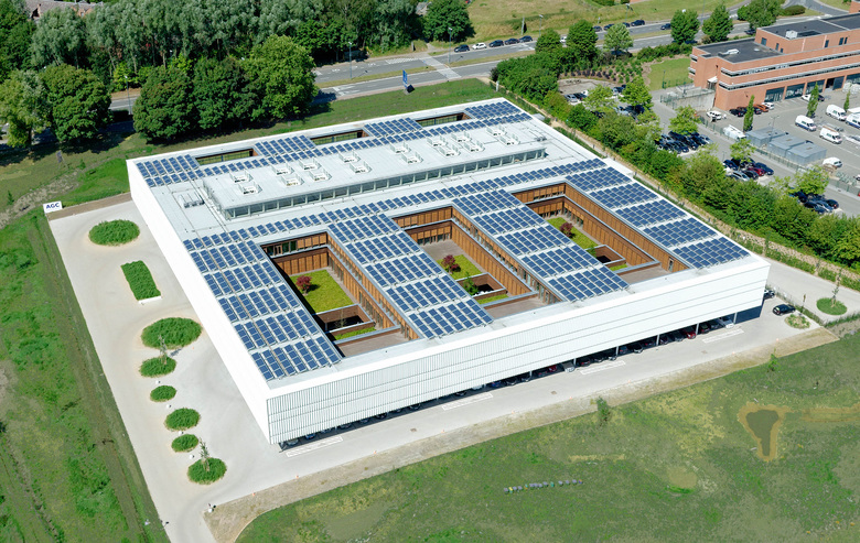 AGC products –  The project demonstrates numerous uses of glass-based products (vision glasses, enamelled and sand spandrel glass, LED glass, screen-printed glass, photovoltaic panels etc.) in a bid to showcase the AGC products as well as possible. The entrance to the building, in particular, is signposted by a large sculpture in glass.