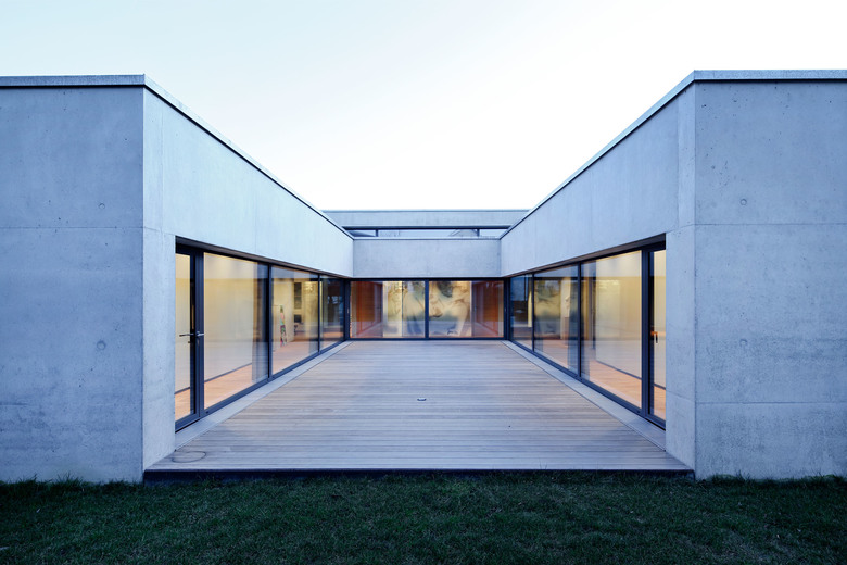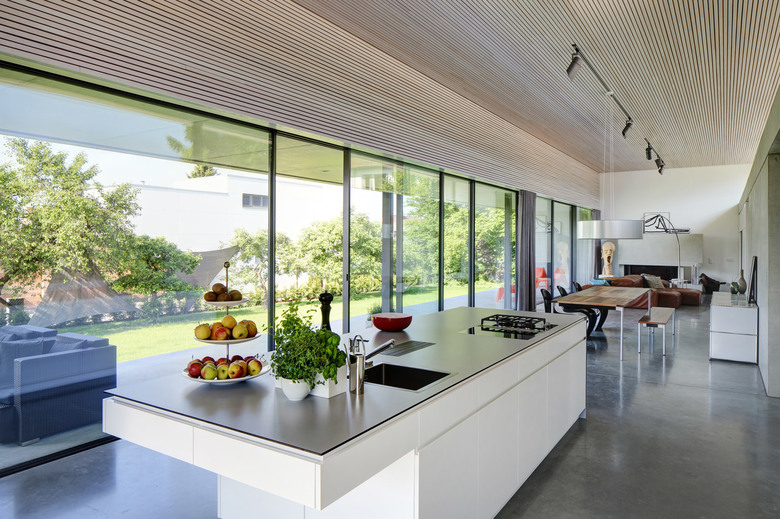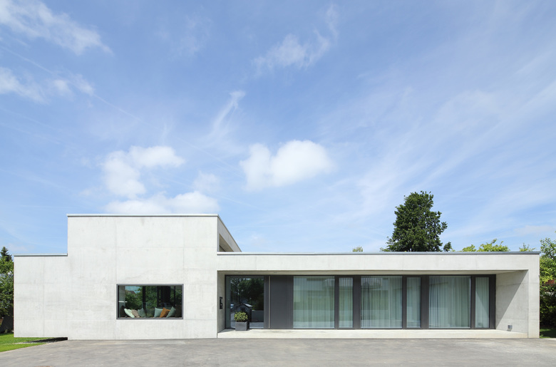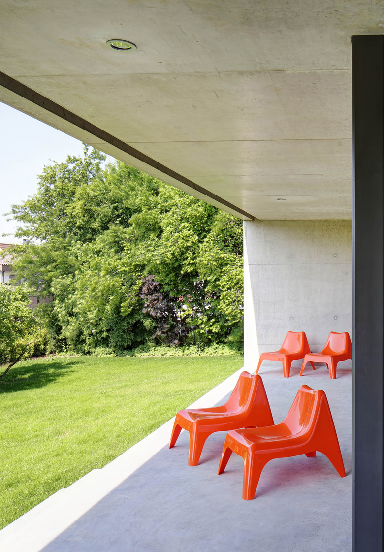 Der Wunsch unserer Bauherrschaft war es, ein Haus zu planen, das alle Räume auf nur einer Ebene vereint. Das neue Wohnhaus platziert sich bewusst zentral auf dem Grundstück, um allen Räumen einen adäquaten Bezug zum Außenraum zu bieten. Dieser Bezug wird durch allseitig eingeschnittene Terrassen verstärkt, sodass das Gebäudevolumen und der Außenraum in einem ständigen Dialog stehen. Die innere Organisation differenziert in ihrer Gebäudestaffelung zwischen privaten und gemeinschaftlichen Lebensbereichen. Zwischen den beiden Bereichen gliedert sich der Hauseingang mit Garderobe, verbunden mit einem offenen Bürobereich. Die Grundrissgestaltung lässt ein großes Maß an räumlichen Verknüpfungen zu, wobei sich bei Bedarf Bereiche durch Schiebetüren zueinander abgrenzen lassen. Im Wohnbereich, mit über vier Metern Raumhöhe, wird die Verflechtung der unterschiedlichen Höhen sichtbar gemacht, indem die Sichtbetondecke des niederen Bauteils einschneidet.