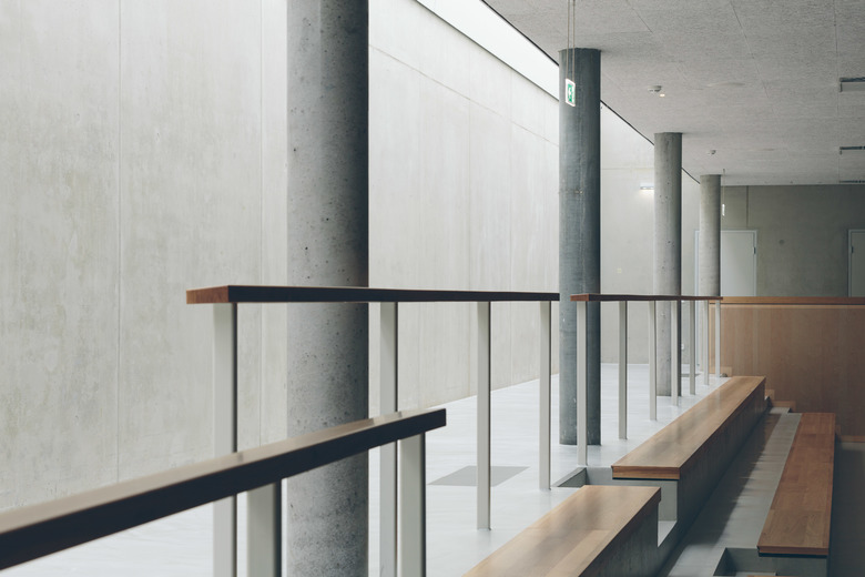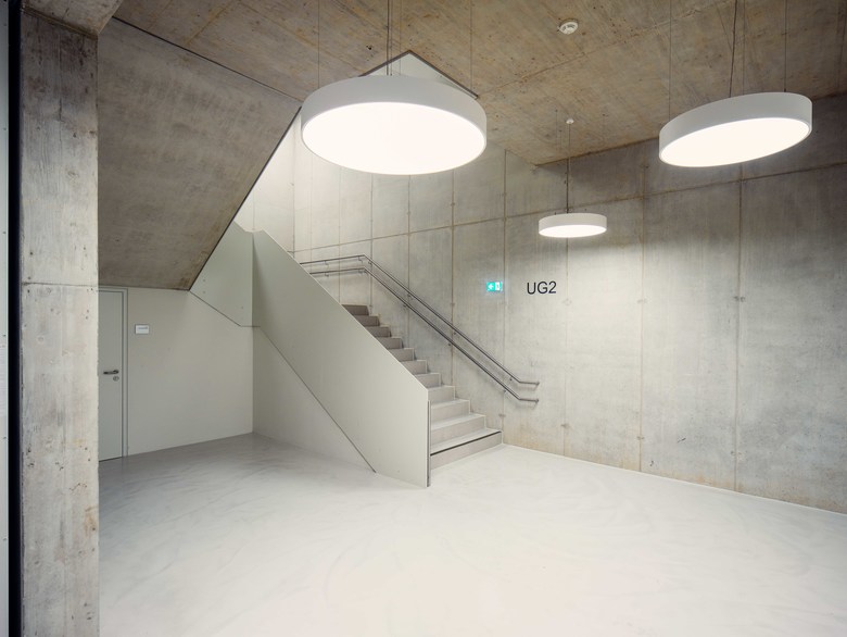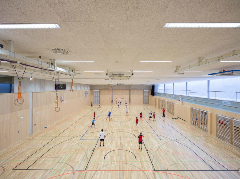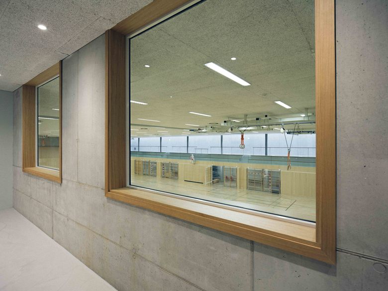 Das Materialkonzept des Kindergartens wird mit der weißen Holzwolle-Akustikdecke und dem warmen Eichenholz für die Fensterrahmen, Türen, Handläufe und Sitzbänke der Zuschauertribüne in der unterirdischen 44 x 22 Meter großen Dreifachturnhalle fortgesetzt. Als dominierender Akzent entschieden sich die Architekten hier für die raue Haptik des Sichtbetons und einen hellen, mineralischen Fliessbelag, um das Unterirdische, Mineralische und Höhlenartige bewusst zu zitieren.