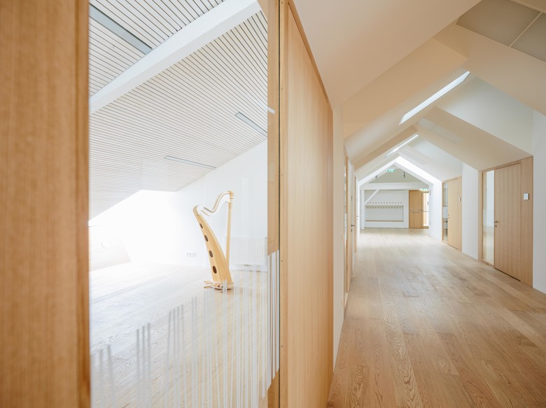 Die Sporthalle ist durch einen unterirdischen Gang mit der alten Volksschule verbunden. Unter deren historischem Walmdach entstand auf nur 550 Quadratmetern eine Musikschule mit sechs Übungsräumen und einem großen Vortragsraum mit breiter raumsparender Sitzfläche statt Bestuhlung.