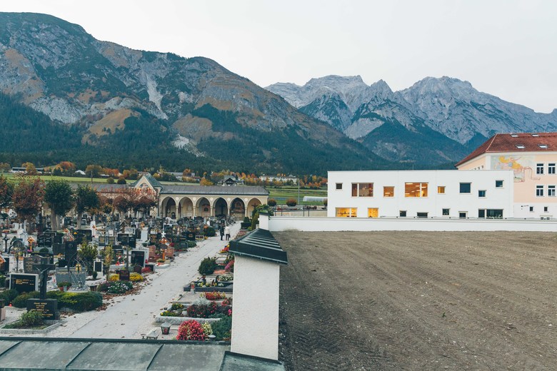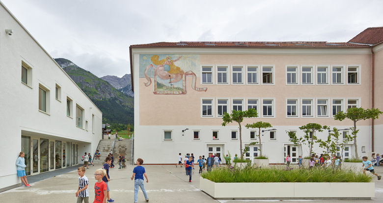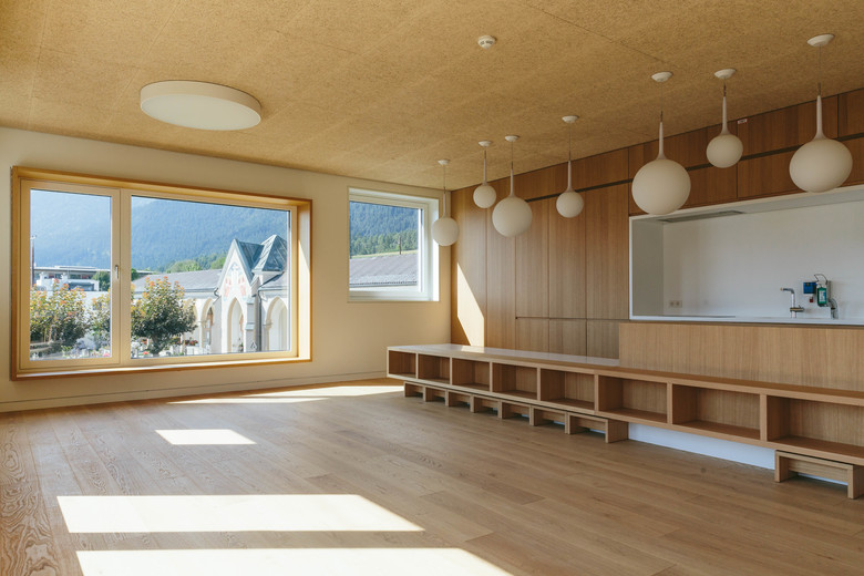 Mit der 110 Jahre alten, denkmalgeschützten Volksschule wird so durch den neuen Kindergarten nicht nur ein geschützter und dennoch einladender Pausenhof vor dem Hintergrund der malerischen alpinen Kulissen des Karwendelgebirges generiert, sondern auch ein in seinem Volumen dem dörflichen und kindlichen Maßstab angemessener Baukörper geschaffen, der sich harmonisch in das bestehende Ensemble einfügt. Der nur zweigeschossige Holzbau wurde analog zur Umgebung mit Kratzputz verkleidet.