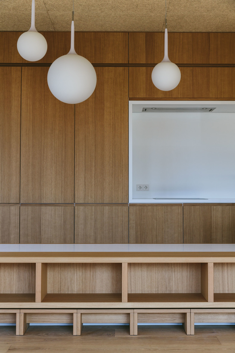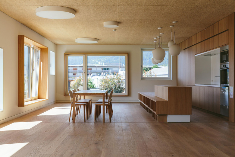 Das Farb- und Materialkonzept in Pastellfarben, mit geölten Eichenholzeinbauten, Eichenmassivparkett, Filzvorhängen und hellbrauner Holzwolle-Akustikdecke ist bewusst dezent gehalten, genauso wie die von Schenker Salvi Weber entworfenen, regional handwerklich hochwertig verarbeiteten Möbel aus geöltem Eichenholz. Die Vollholz-Kindertische und -stühle stammen aus der Tiroler Möbelfabrik Hussl.