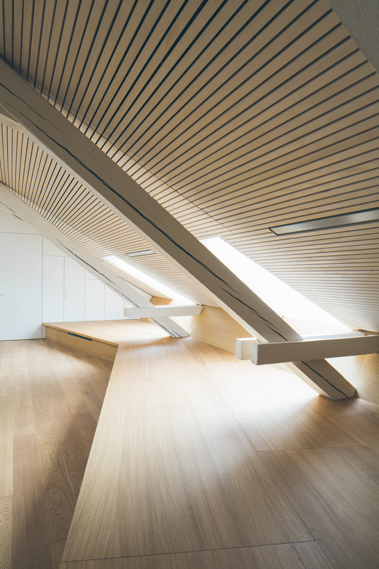 Auch hier wird die Materialität vom Kindergarten und der Turnhalle zitiert. Das warme Eichenholz kombiniert mit dem weiß gestrichenen Dachstuhl und der akustisch wirksamen, weiß lasierten Lattenverkleidung macht einen hellen und feierlichen Eindruck und lässt die kleinen Räume großzügig wirken.