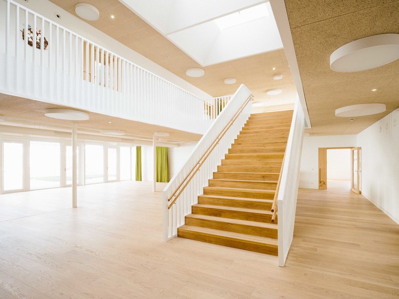 Das Haus bietet 120 Kindergarten- und 24 Krippenplätze, die sich auf acht Gruppenräume aufteilen. Die unterschiedlichen großen Perforierungen in der Fassade, in deren Laibungen man sitzen kann, bieten im wahrsten Sinne des Wortes „auf Augenhöhe“ gerahmte Ausblicke in die Natur – für die Kleinen wie die Großen. Nischen, Gemeinschaftsflächen, offene und intime Raumsequenzen wechseln sich ab und gehen ineinander über. Deren Funktionen kann von den BetreuerInnen durch Türen, Vorhänge, Schiebetüren je nach Bedarf für kleinere Gruppen, Kreativspiele, Mittagsschlaf und so fort geändert werden und ermöglicht einen guten Überblick über das Geschehen.