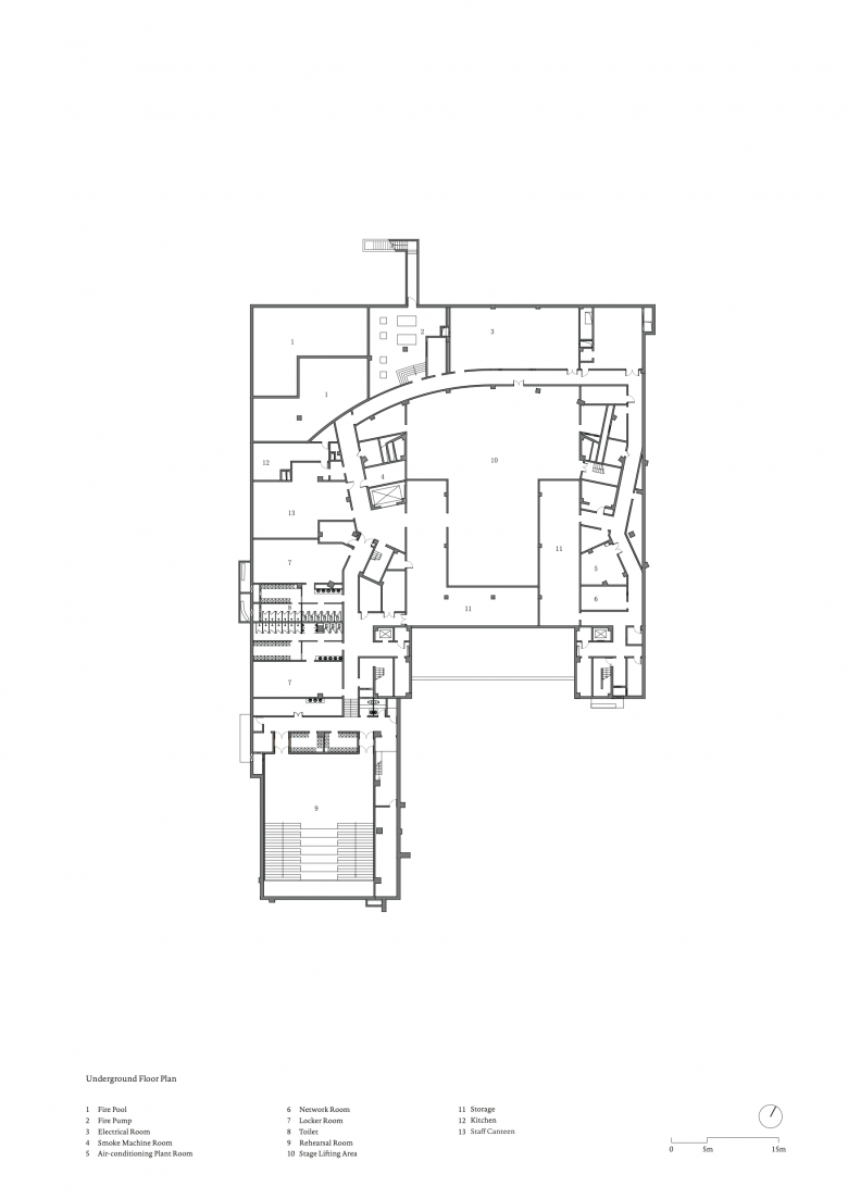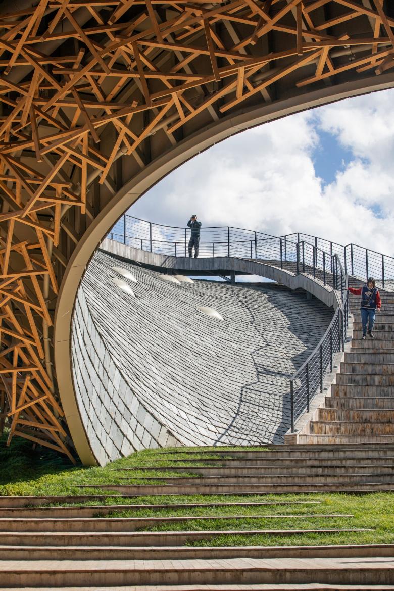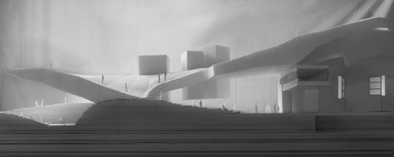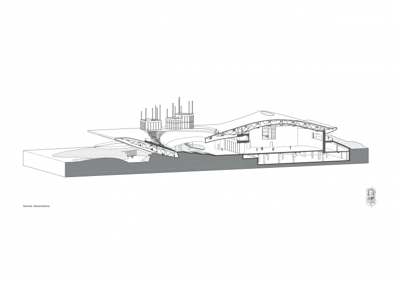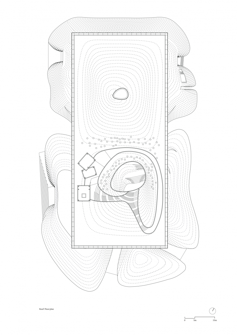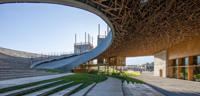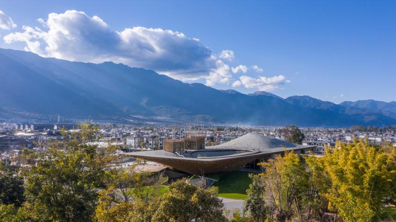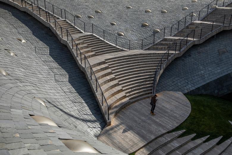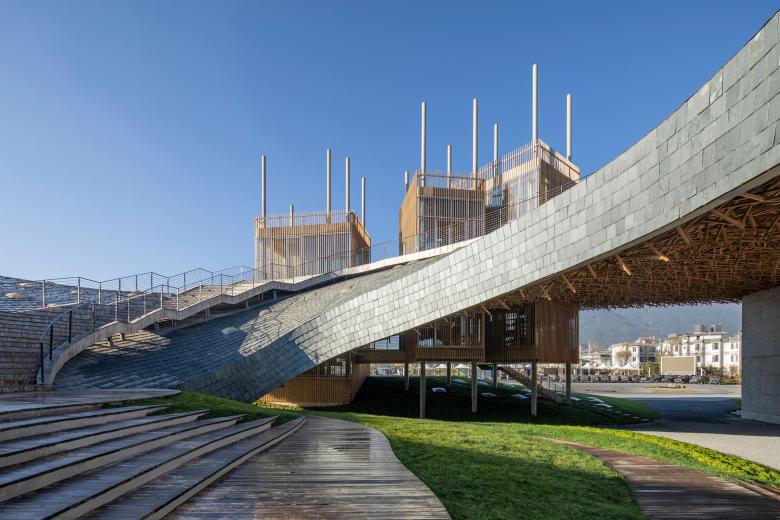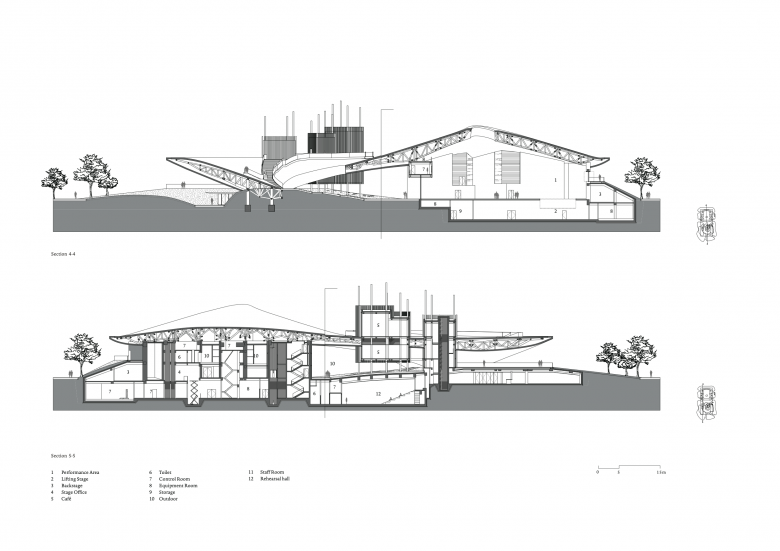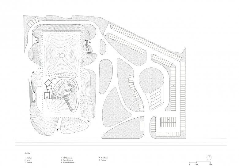 Inspired by the powerful surrounding landscape, Zhu Pei searched for landscape-related references to solve the architectonic challenges for the Performing Arts Center. A widely cantilevered rectangular roof spans across a built landscape of free-flowing indoor and outdoor spaces, some of which can be combined as an interacting spatial system. As with mountains and valleys, the strong shape of the roof reflects the more organic landscape below and points to the old Chinese principle of yin and yang, where two opposites combine together to form a whole. Formally expressed as organic-shaped hills, the partly sunken spaces transform into a natural garden landscape, promising a high experiential quality that extends inside to the public theatre.
